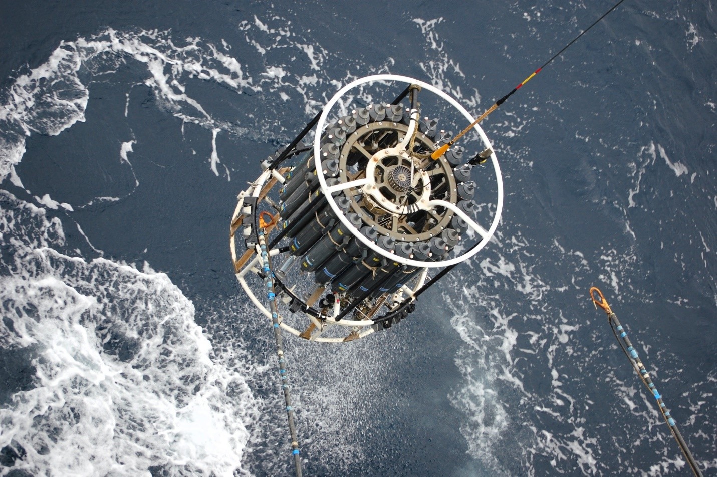 Figure: Overboard deployment of a Conductivity, Temperature, and Depth (CTD) profiling package with sampling bottles and optical sensors