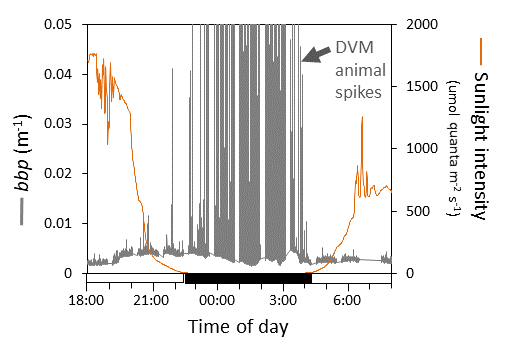 Figure:Example of the day-night changes in bbp observed by Dr. William Burt during a field campaign in the subarctic Pacific showing the nighttime appearance of large spikes from DVM animals.