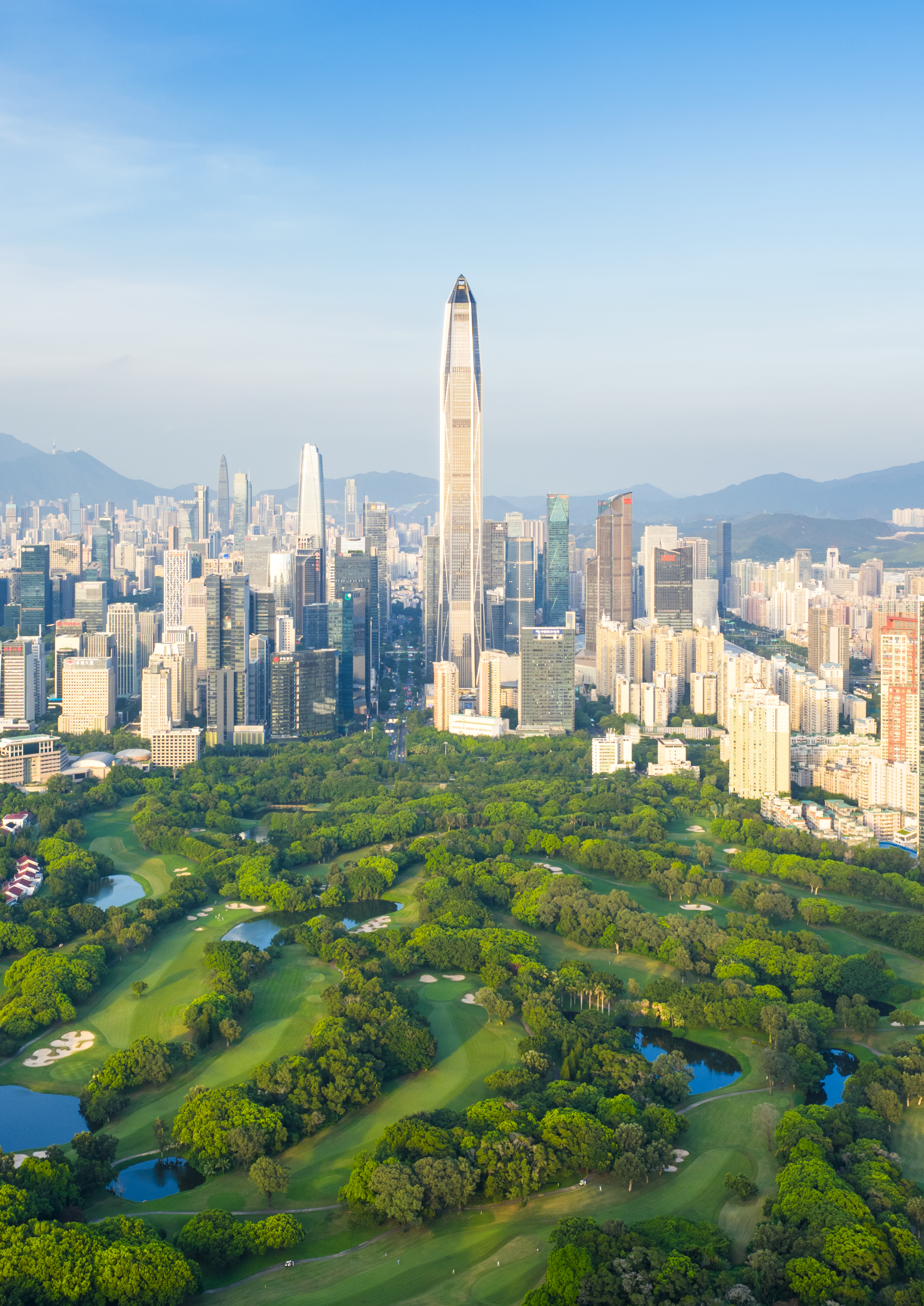Photograph of Shenzhen, China, where a dense urban core is surrounded by extensive vegetation, highlighting how landscapes beyond cities can modulate rainfall within them.