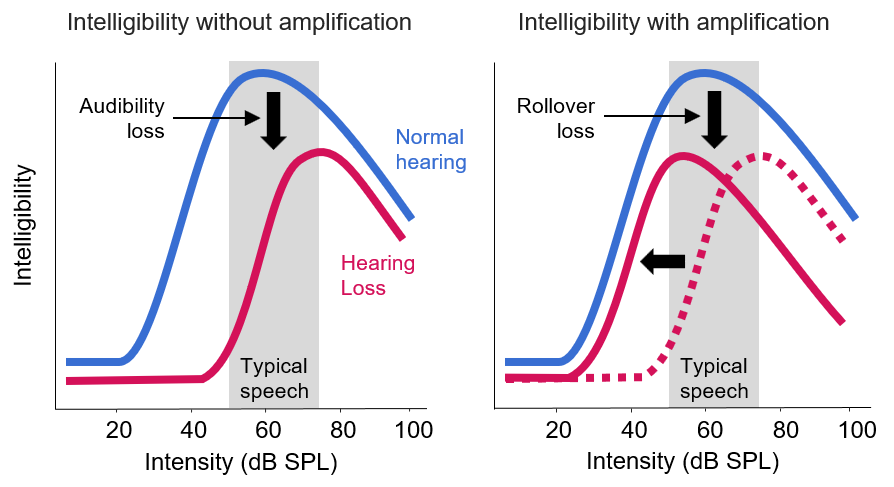 Figure 2 | The hearing aid dilemma: With normal hearing (blue), the intelligibility of speech is high at typical conversational sound levels but decreases at higher levels, an effect known as rollover. With hearing loss (red, left), intelligibility is decreased at conversational levels because of decreased audibility. With amplification (red, right), the audibility of speech is restored but the effects of rollover keep intelligibility below normal.