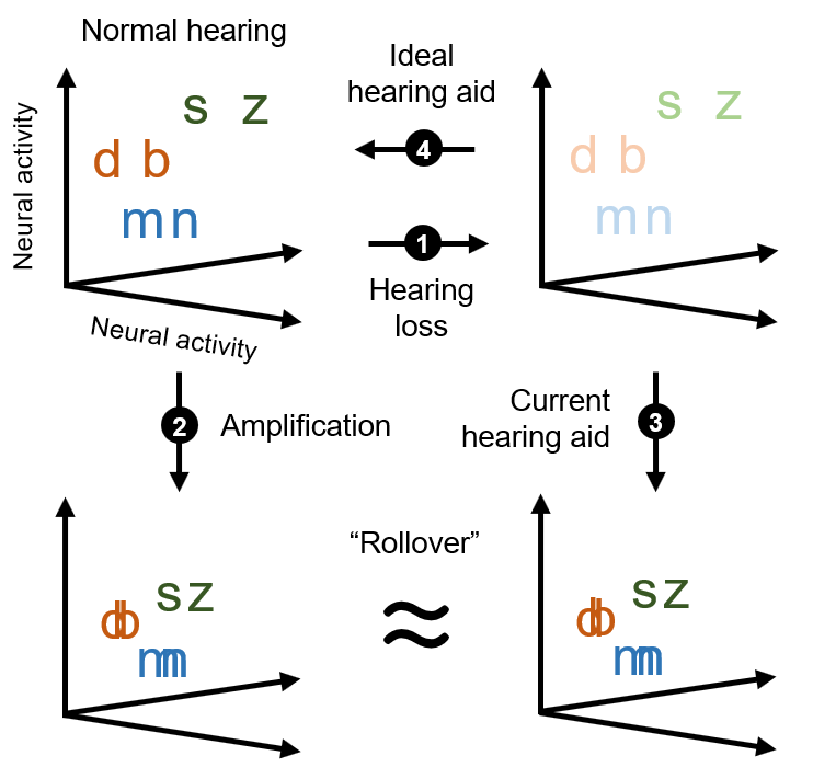 We started by comparing the neural code for speech with normal hearing and hearing loss. We found, as expected, that hearing loss weakened neural activity in general and made the activity patterns elicited by different speech syllables more difficult to distinguish, reflecting decreased audibility and intelligibility (see Figure 1 for a schematic illustration of our results). We then examined the neural code for speech with hearing aids and found that activity was returned to normal strength overall, but the patterns elicited by different speech syllables remained hard to distinguish.