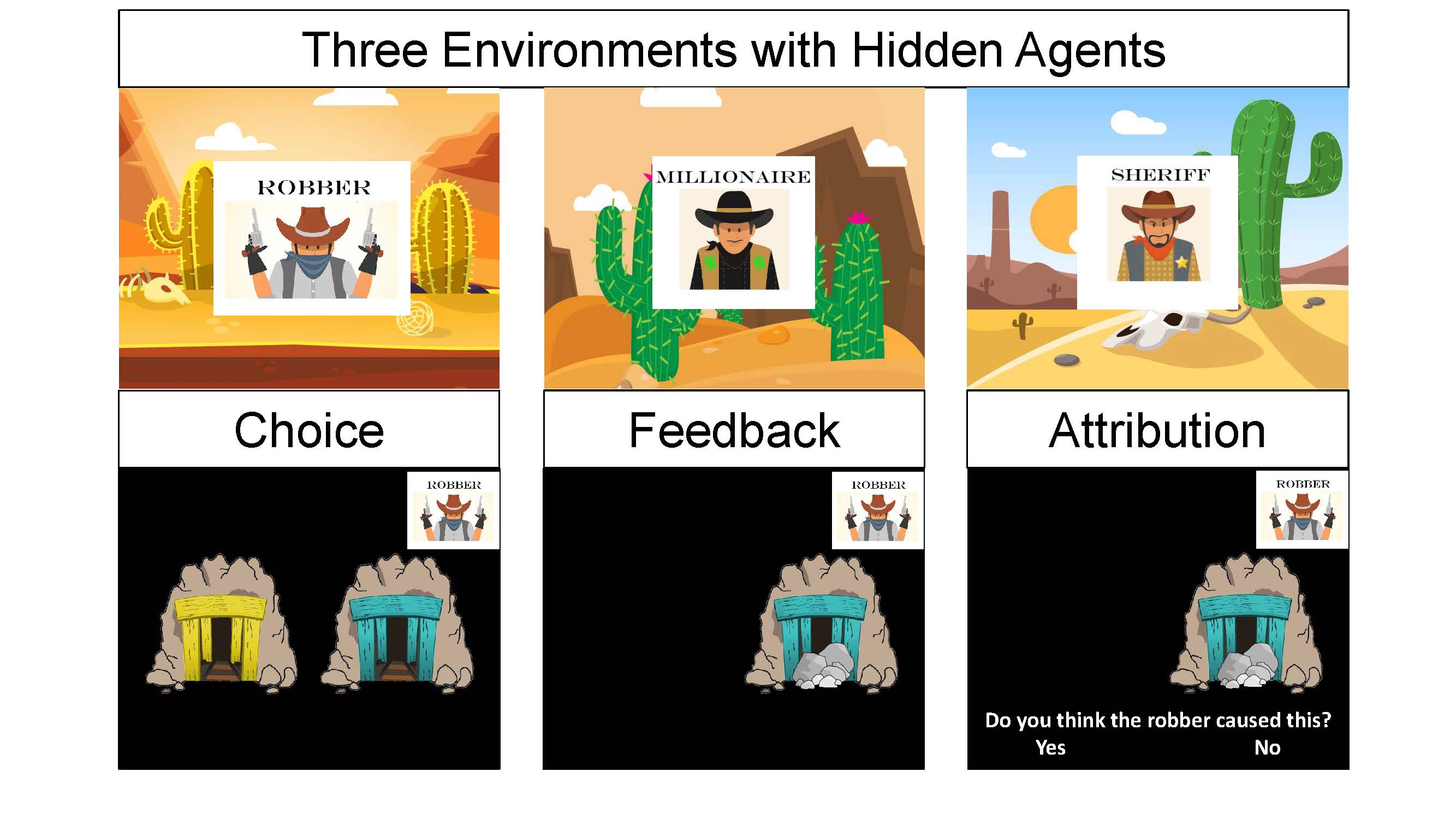 Critically, participants mined for gold in three different territories, which were inhabited by three different hidden agents. In millionaire territory, a nice millionaire would sometimes replace all the rocks in both mines with gold. If the millionaire intervened on a given trial, the participant would always receive gold, regardless of where they chose to dig. In robber territory, a mean robber would sometimes replace all the gold in the mines with rocks, meaning participants would receive rocks regardless of their choice. And in sheriff territory, a sneaky sheriff mixed around the gold and the rocks, meaning participants would have an equal probability of receiving gold or rocks, regardless of their choice of mine. Importantly, while participants were told which territory they were in, they were not told whether a hidden agent intervened on any given trial.