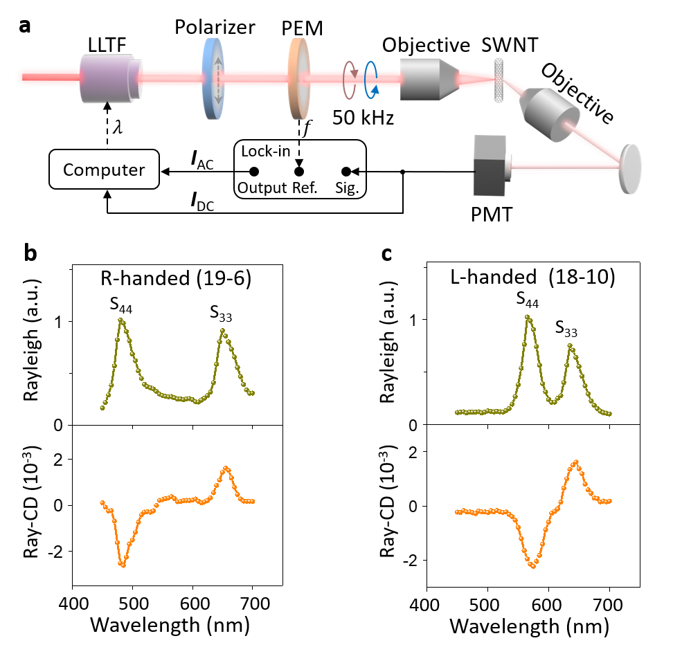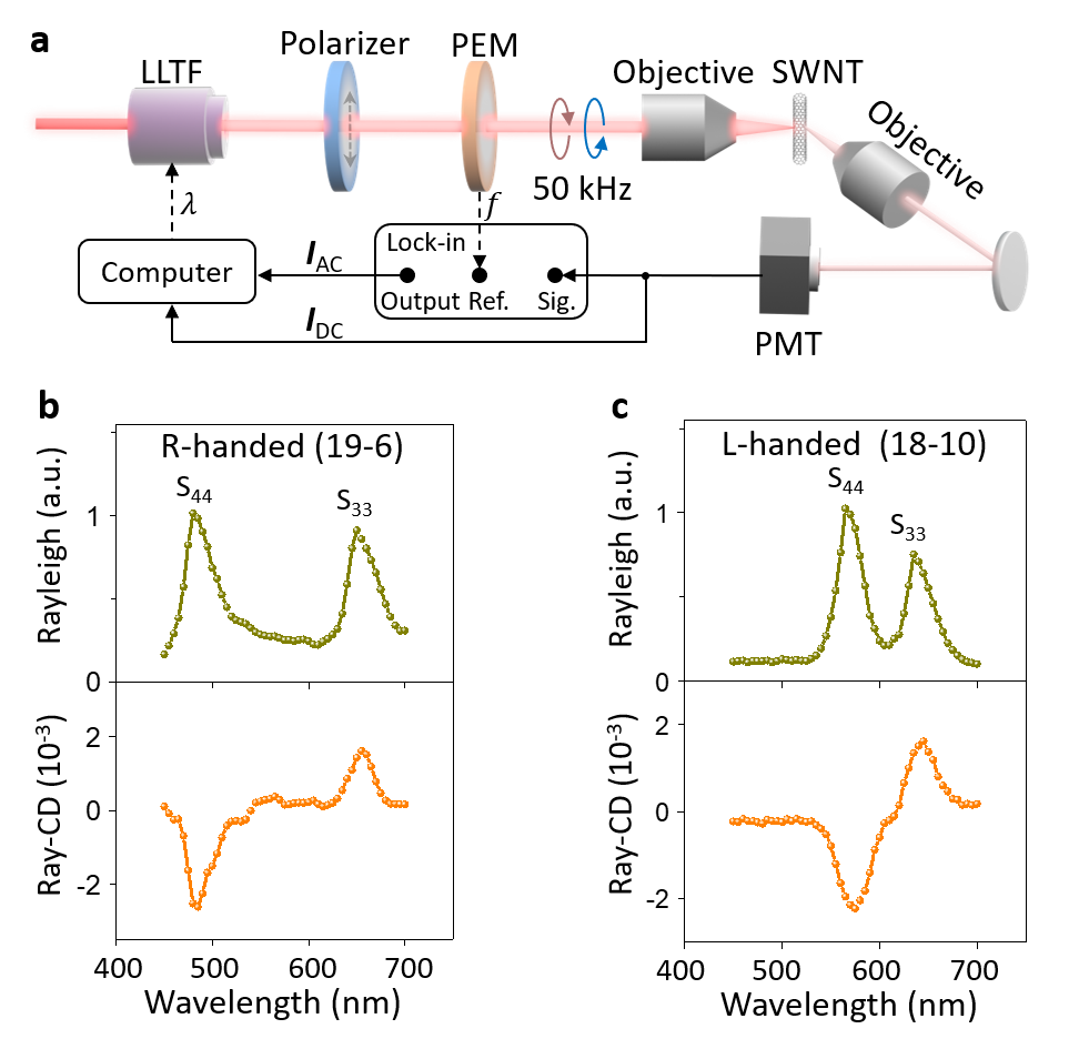 Fig. 2 (a) Schematic of the Ray-CD experimental setup. LLTF, laser line tuneable optical filter; PEM, photoelastic modulator; SWNT, single-walled carbon nanotube; PMT, photomultiplier tube. (b-c) Typical Ray-CD results for two representative nanotubes. Optical transitions were marked above each peak, based on which chiral indices of these nanotubes were determined. Furtherly, their handedness were identified by the signs of Ray-CD at peaks and their type category.