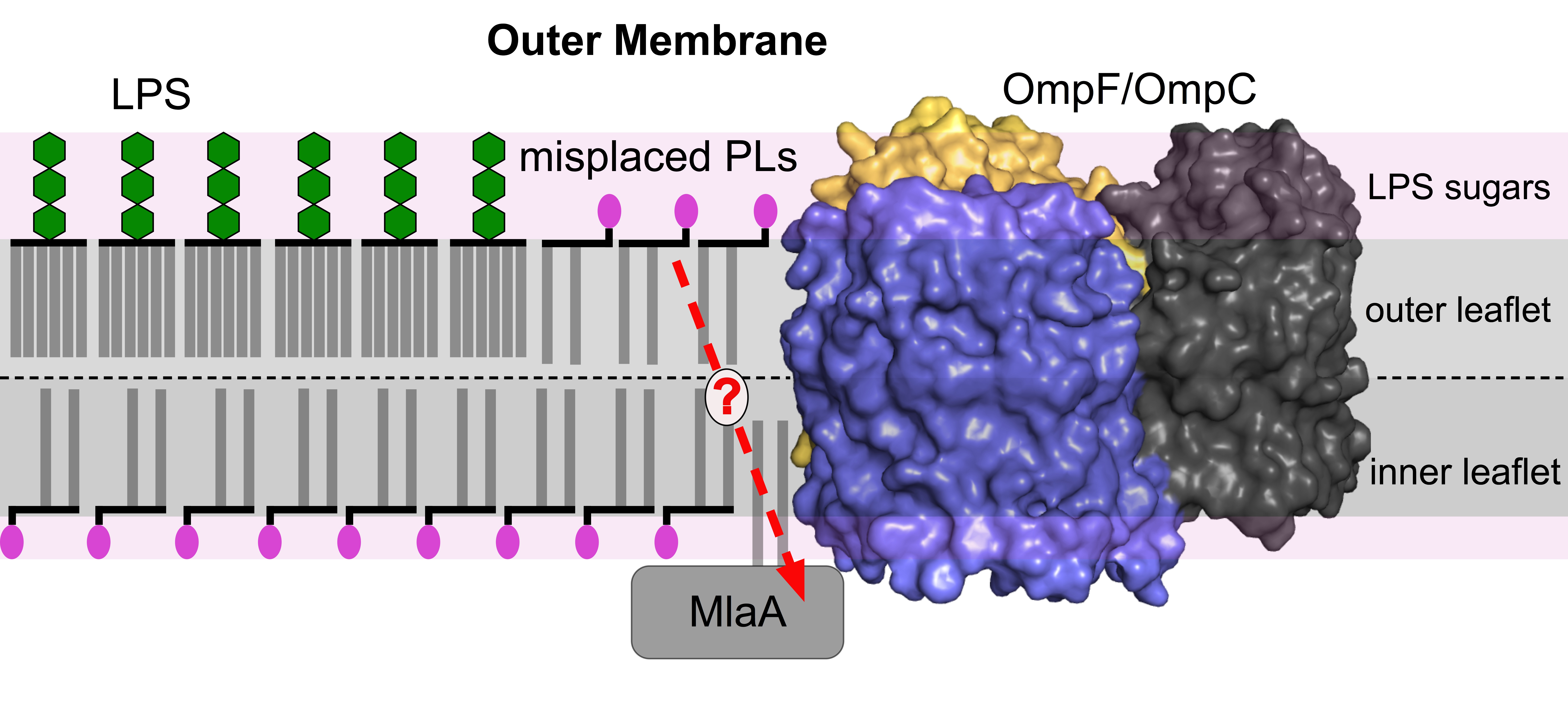 Figure 1. Representation of the OM with some misplaced PLs in the outer leaflet. MlaA is shown as a typical lipoprotein. Also note the porin-MlaA interaction.