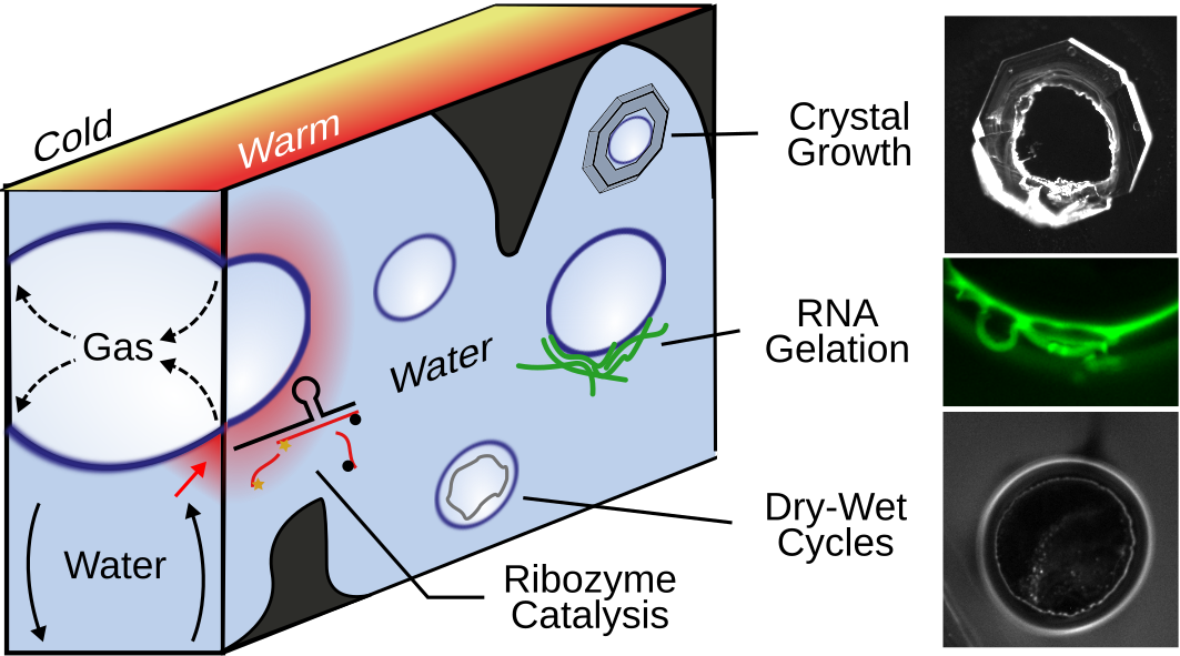 Experimentally, we use microfluidic chambers (Figure 1) to simulate pores inside rocks and to establish a temperature gradient across a water-filled compartment. The temperature gradient provides a continuous energy supply that pushes the system away from equilibrium. By adding the gas-bubble, we have found that it drives a continuous evaporation-recondensation cycle inside the bubble that accumulates molecules at its rim and allows for continuous dry-wet cycles (Figure 2, left).