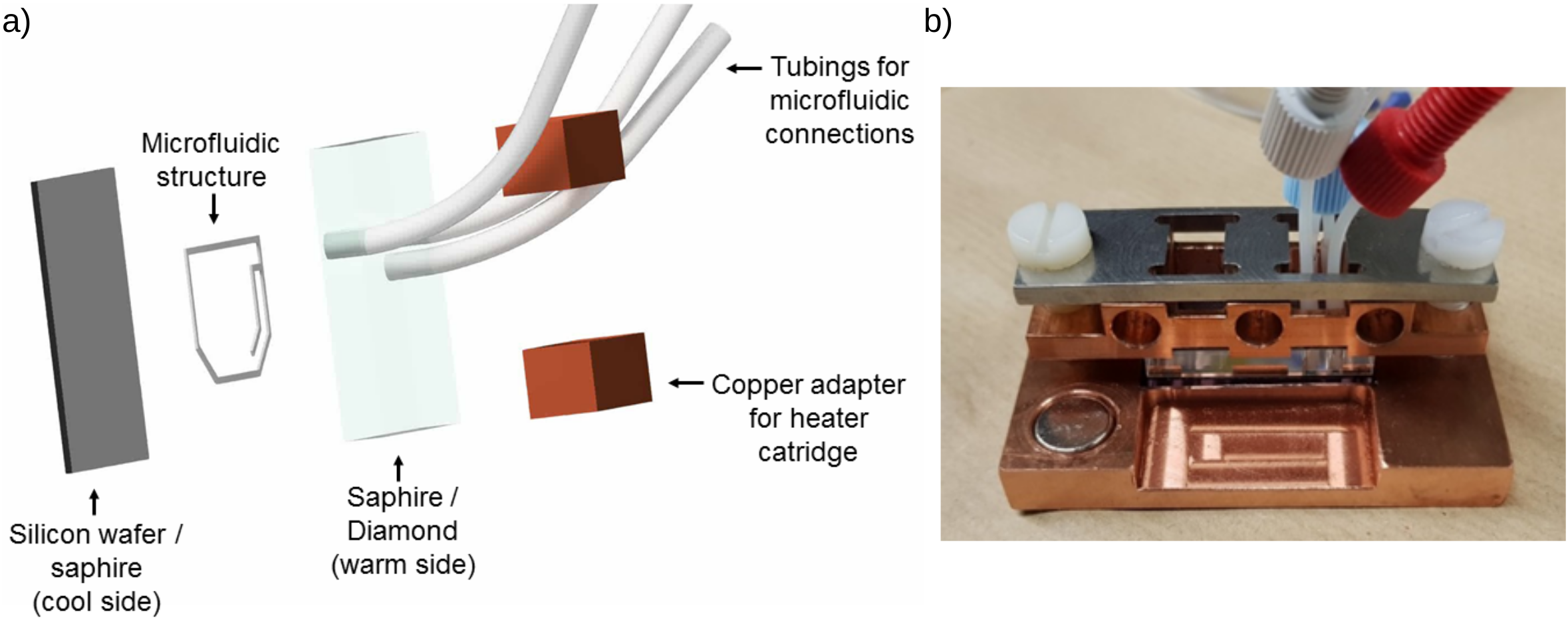 Figure 1: Microfluidic chamber. a) Exploded view drawing of microfluidic structure. The backside is cooled by a water bath while the sapphire crystal in the front is heated by heater cartridges from 3D printers. The sapphire gives optical access to the chamber and connects to microfluidic tubing. b) The final chamber has a larger copper holder at its bottom, which connects the silicon wafer to the water bath. Screws press down the sapphire onto the structure, giving stability and making the chamber airtight