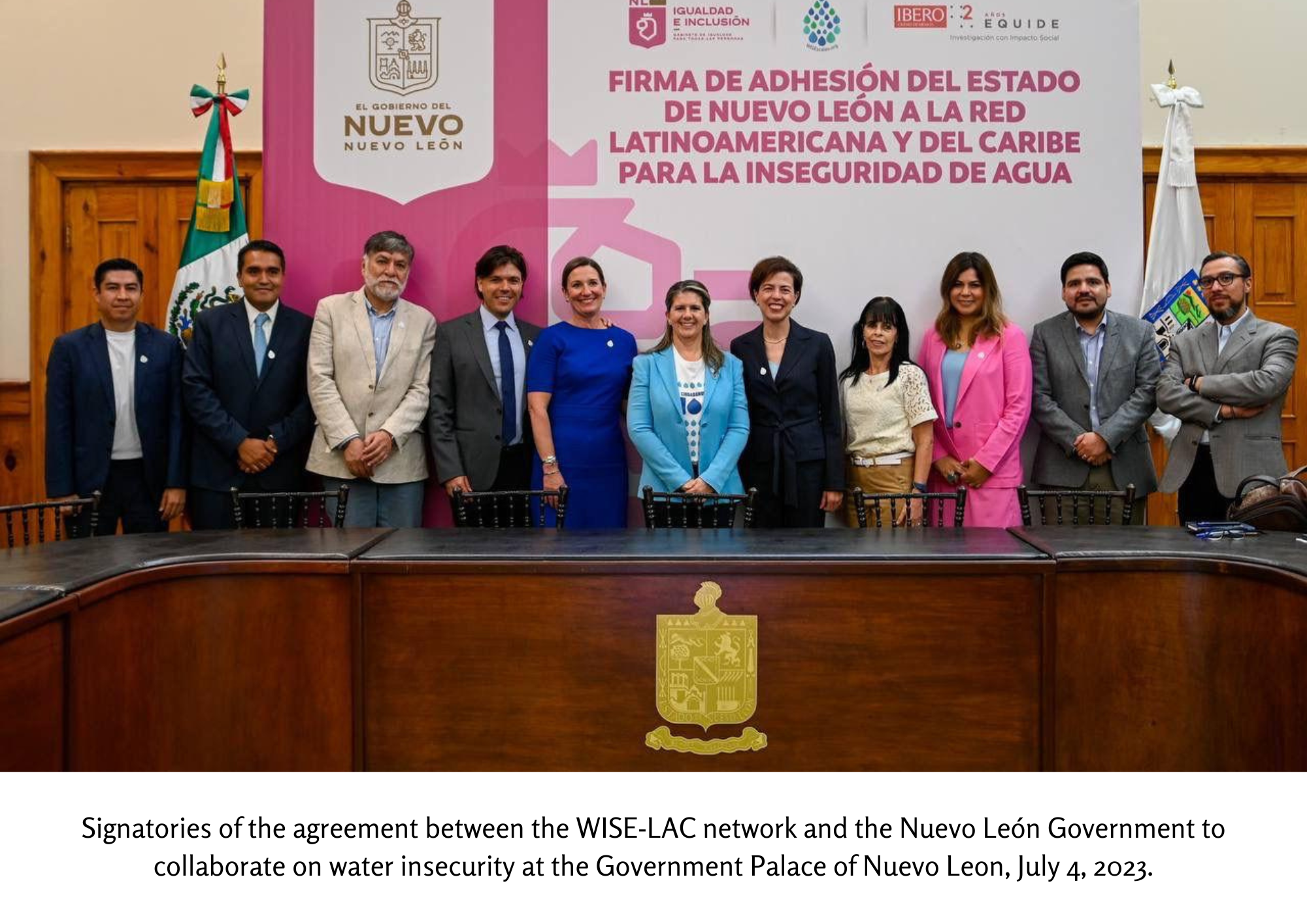 Signatories of the agreement between the WISE-LAC network and the Nuevo León Government to collaborate on water insecurity at the Government Palace of Nuevo Leon, July 4, 2023.