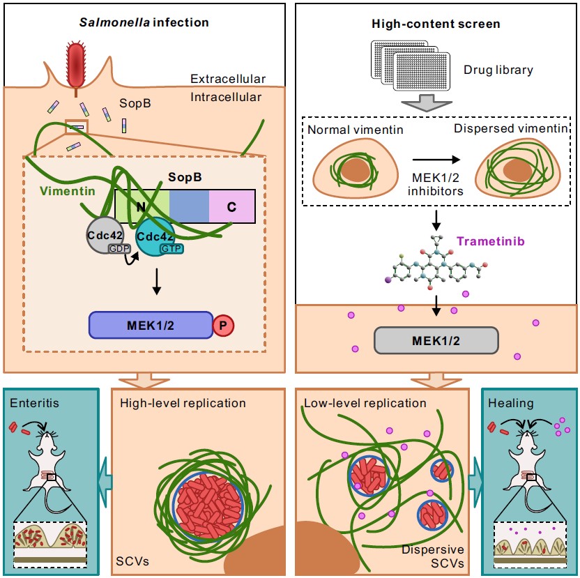 Zhao S#,Xu Q#,Cui Y#,Yao S,Jin S, Zhang Q,Wen Z,Ruan H,Liang X, Chao Y, Sansonetti P,Wei K*,Tang H*,Jiu Y* “Salmonella effector SopB reorganizes cytoskeletal vimentin to maintain replication vacuoles for efficient infection”. Nature Communications. Jan30;14(1):478. doi:10.1038/s41467-023-36123-w. 2023.