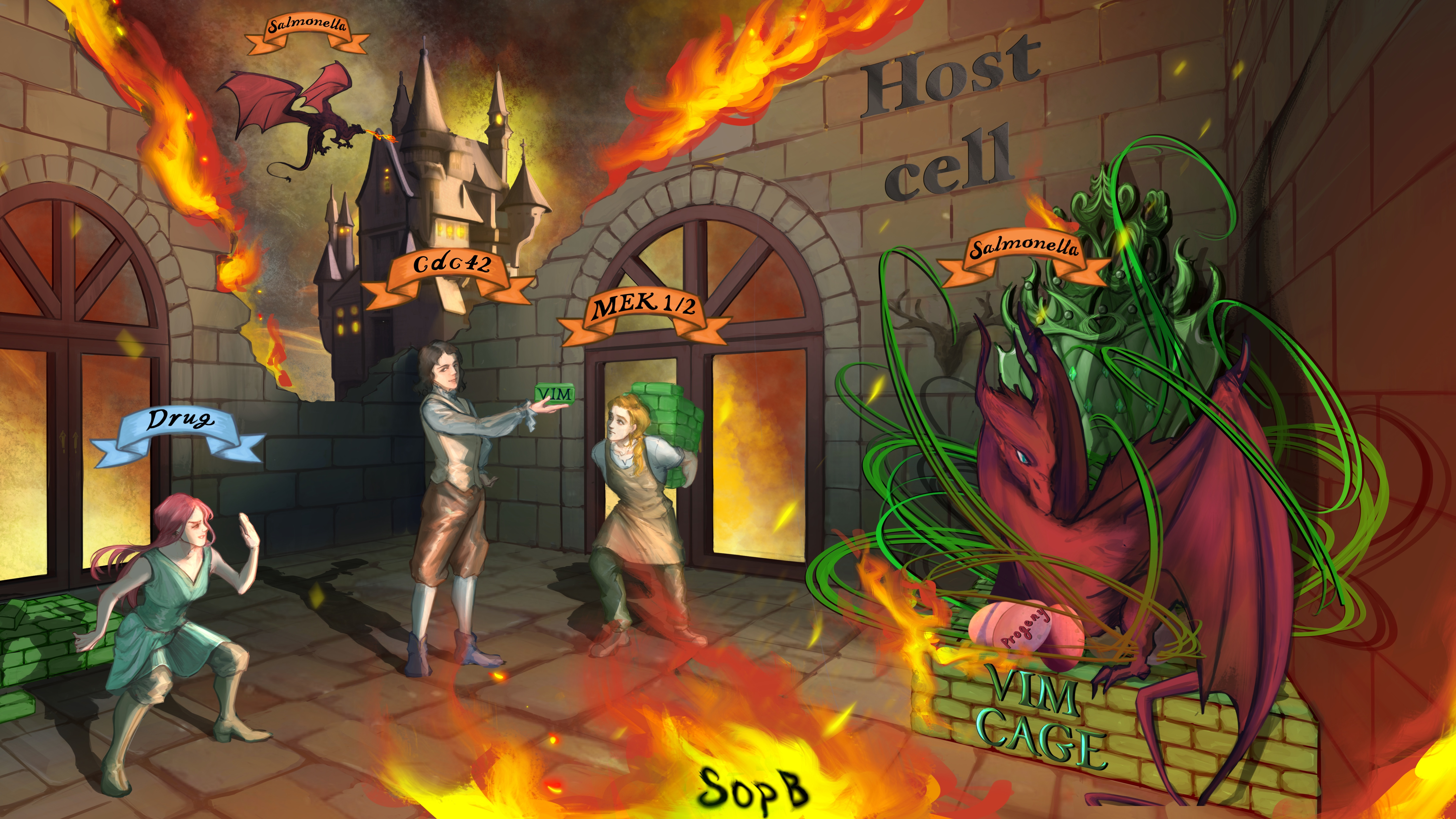 The sad part of this drama is that ‘V’, who belonged to a member of the homeland, was hijacked as hostage by terrorists. Our work aims to find ways to prevent the ‘betray’ of ‘V’. In order to wake up ‘V’, we set up a screen platform to prevent ‘V’ from being taken. A clinical drug ‘T’ was subsequently found, which was originally an anti-tumor drug. However, we found drug ‘T’ can lock up brick ‘V’ and kept it from being moved within the homeland, so that the homeland SCV is not able to build. The components in the host cell protect the human body just like the way we guard our homeland. Every individual makes ‘mistake’. Therefore, the constant searching for safeguards to monitor the system can be used to repair errors. In our story, fixing the ‘mistake’ not only fends off the invasion of the terrorist ‘Salmonella’, but also saves homeland member ‘V’. ‘V’ remains as intermediate filament protein with the most tolerance and resilience ability.