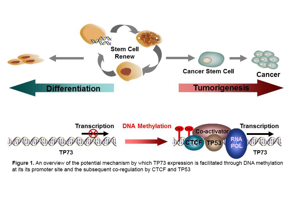 Our findings suggest that relationship between TP53 and TP73 also involves the CTCF protein. This shows that CTCF regulates human TP73 gene expression through direct interaction with its homologue protein, TP53. In this scenario, the TP73 expression is blocked in the absence of DNA methylation. However, the modification of the TP73 promoter site by DNA methylation initiates the recruitment of CTCF and the co-activator, TP53, which leads to transcription of the TP73 gene as shown in Figure 1 below. We currently do not know whether the promoter region of TP73 is frequently methylated in human HCC, and the expression of TP73 is principally regulated by promoter region methylation. Furthermore, we need to explore if methylation precedes not only the expression of TP73 but also the development of HCC or other types of cancers in the GI tract. If so, methylation of the TP73 promoter may serve as a diagnostic and prognostic marker in HCC.