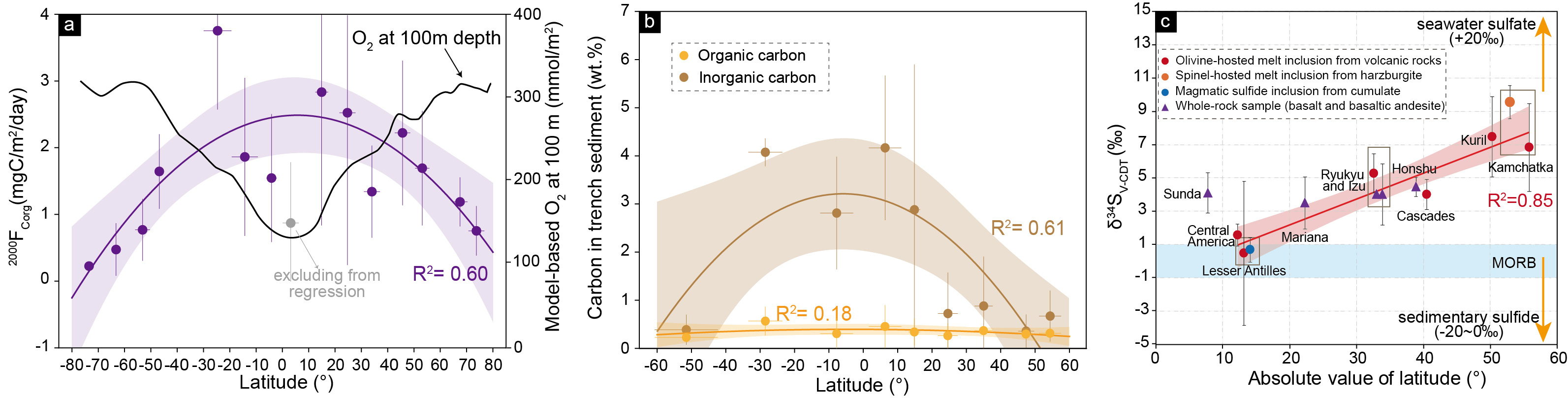 We originally thought that the mechanism should be straightforward, with more organic carbon deposited and subducted in the lower latitude regions, causing the sub-arc mantle to be less oxidized. However, the available data from the ocean showed that there is a clear discrepancy between the sediments deposited on the ocean floor and trenches. Indeed, more organic carbon is deposited on the lower latitude ocean floor, but such a pattern is not observed in the trench sediments yet (Fig. 2, Clift, 2017). Then, we find out that microbial sulfate reduction is quite common in marine sediments, and more organic sediments in the lower latitudes may result in more reduced sulfur in the lower latitudes (Kasten and Jørgensen, 2000). We then look at the data on the sulfur isotope of the arc magma. The sulfur isotope of melt inclusions does show that more reduced sulfur is input in the lower latitudes (Fig. 2). Thus, we suggested that more sulfate is reduced by organic carbon, resulting in less oxidized sub-arc mantle and arc magma in the lower latitudes (Fig .3).