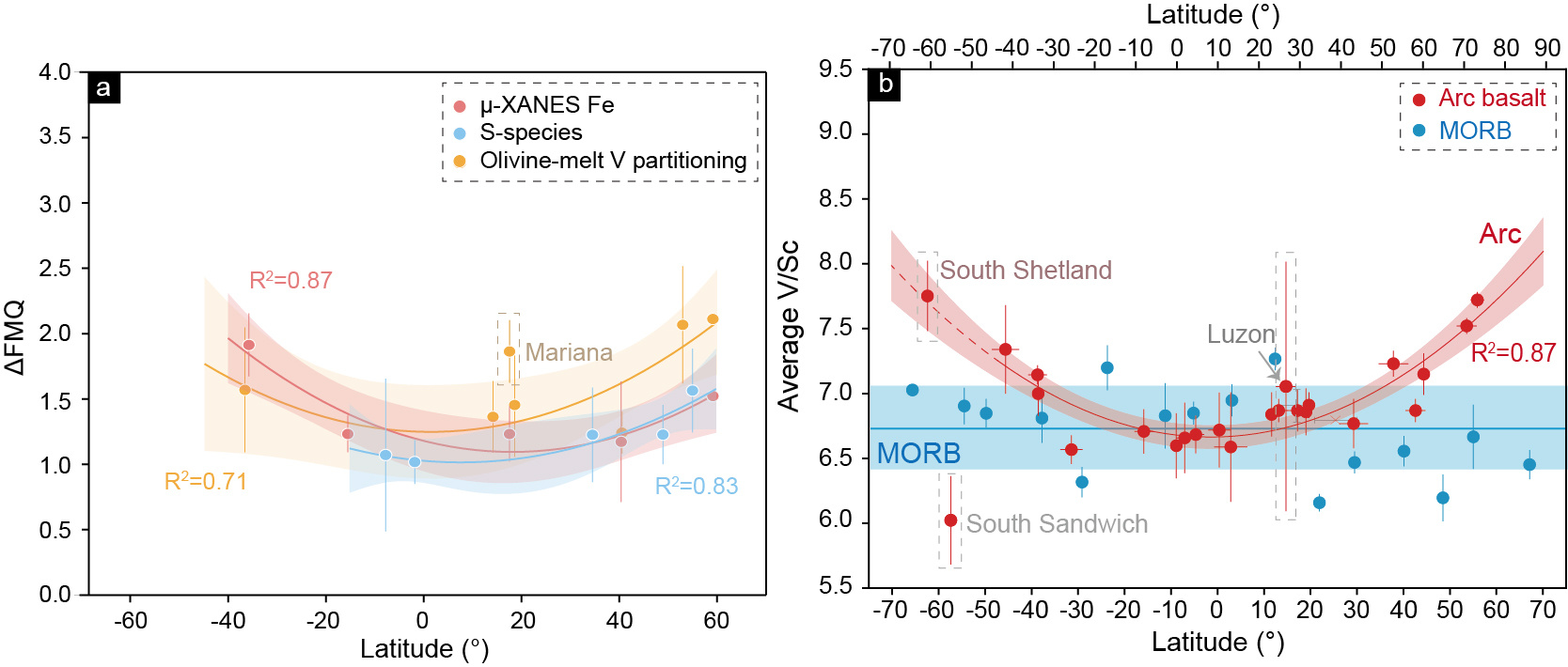 Fig. 1. Relationships between the ΔFMQ of olivine-hosted melt inclusions (a) and V/Sc of basaltic rocks (b) and latitude.