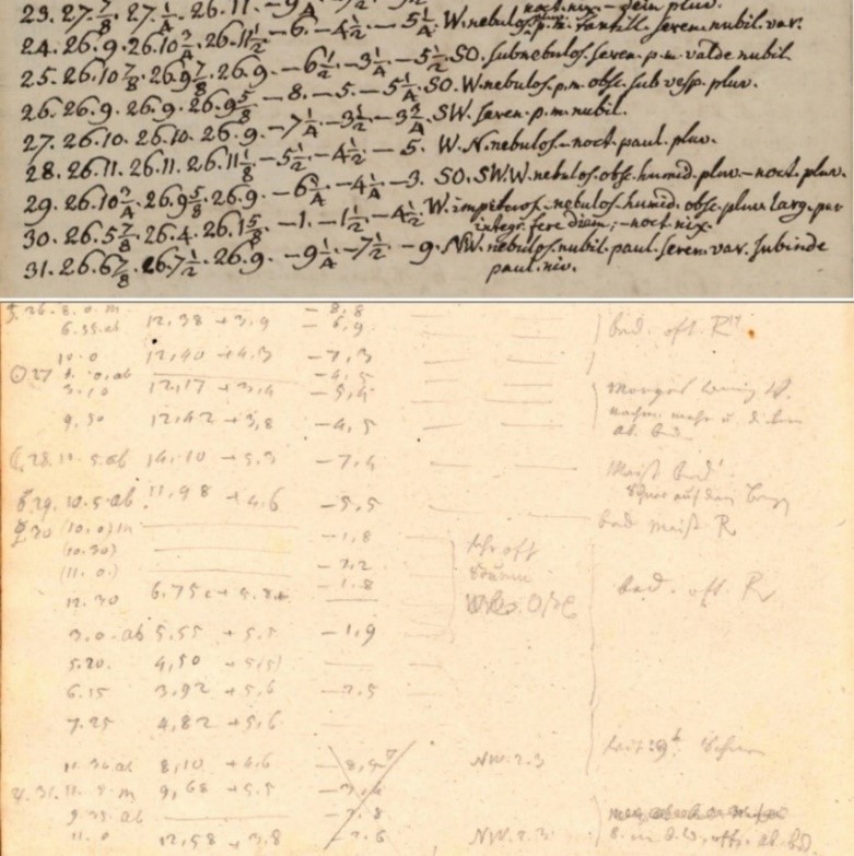 On New Year's Eve 1801, the city of Basel in Switzerland was hit by an extreme flood of the Rhine river [2]. The event was among the dozen or so largest floods since the 14th century. Weather observations from Basel (sheets from two observers, Johann Jakob d'Annone and Daniel Huber, are shown in Fig. 2) indicate heavy precipitation and rather high temperatures (5-9 °C) in the days before the event. From these data and numerous other series, we can reconstruct the daily weather with high spatial resolution [3]. These reconstructions, averaged over the Basel Rhine catchment (Fig. 3, top), confirm that precipitation had been high since mid-November. Much of it may have fallen as snow, but with rising temperatures, snowmelt probably had led to high water levels and saturated soils, on which massive rain fell on 30 December. A reconstruction of daily weather types [4] shows that cyclonic weather types persisted from mid-November to the end of the year. Presumably, central Europe was affected by strong troughing, and the jet stream was displaced to the south.