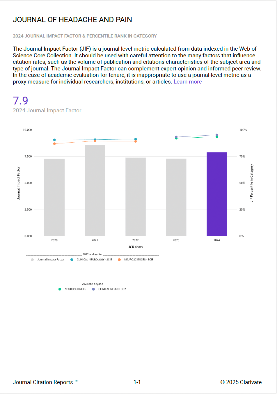 TJHP now stands at 14/285 in the category Clinical Neurology (19/277 in 2023), and in Neurosciences it is now ranked 21/314 (previously 26/310). This is the highest ranking in both categories that the journal has held. In both categories, TJHP is also the highest ranked journal with a specific focus on headache.
