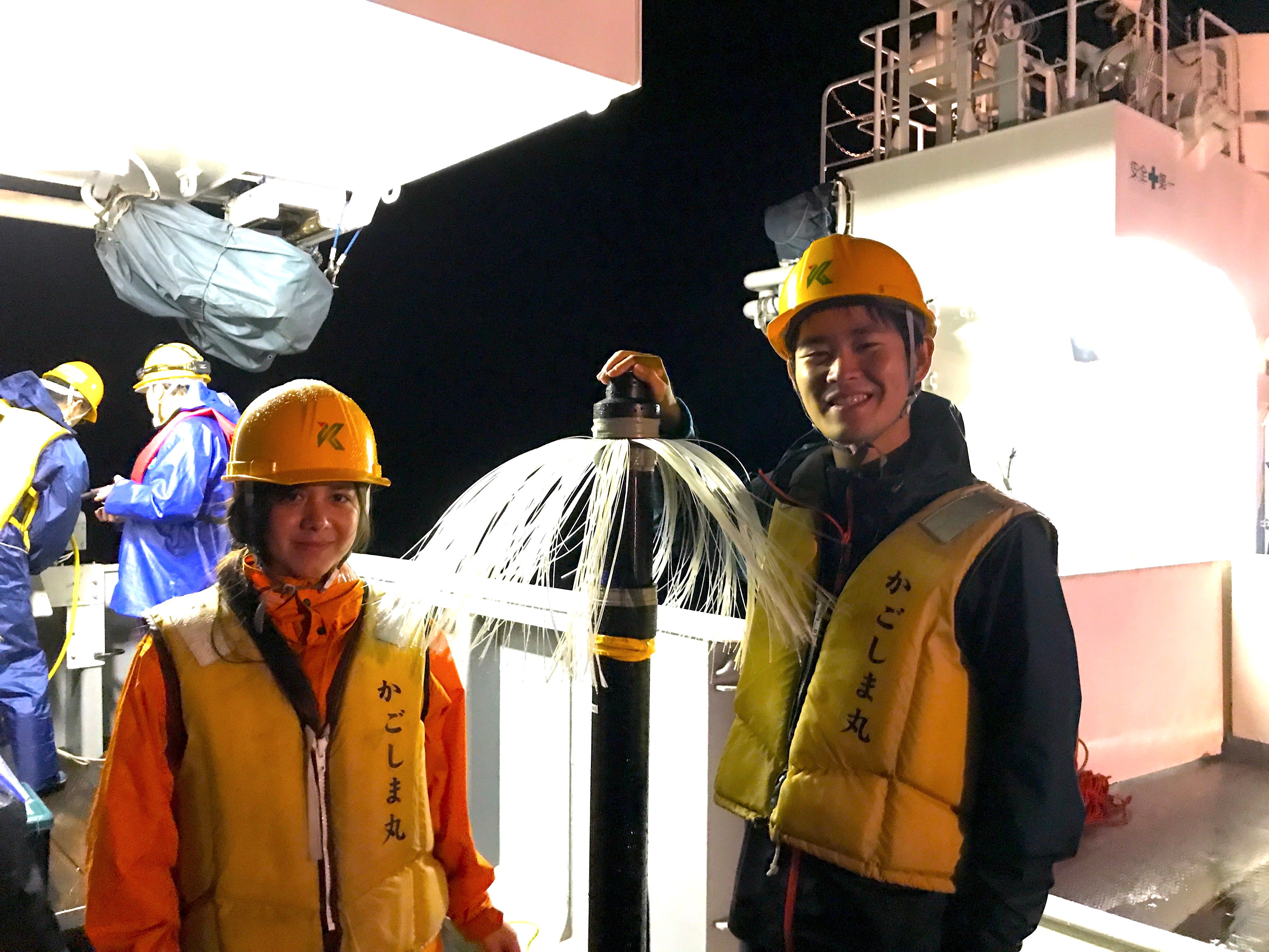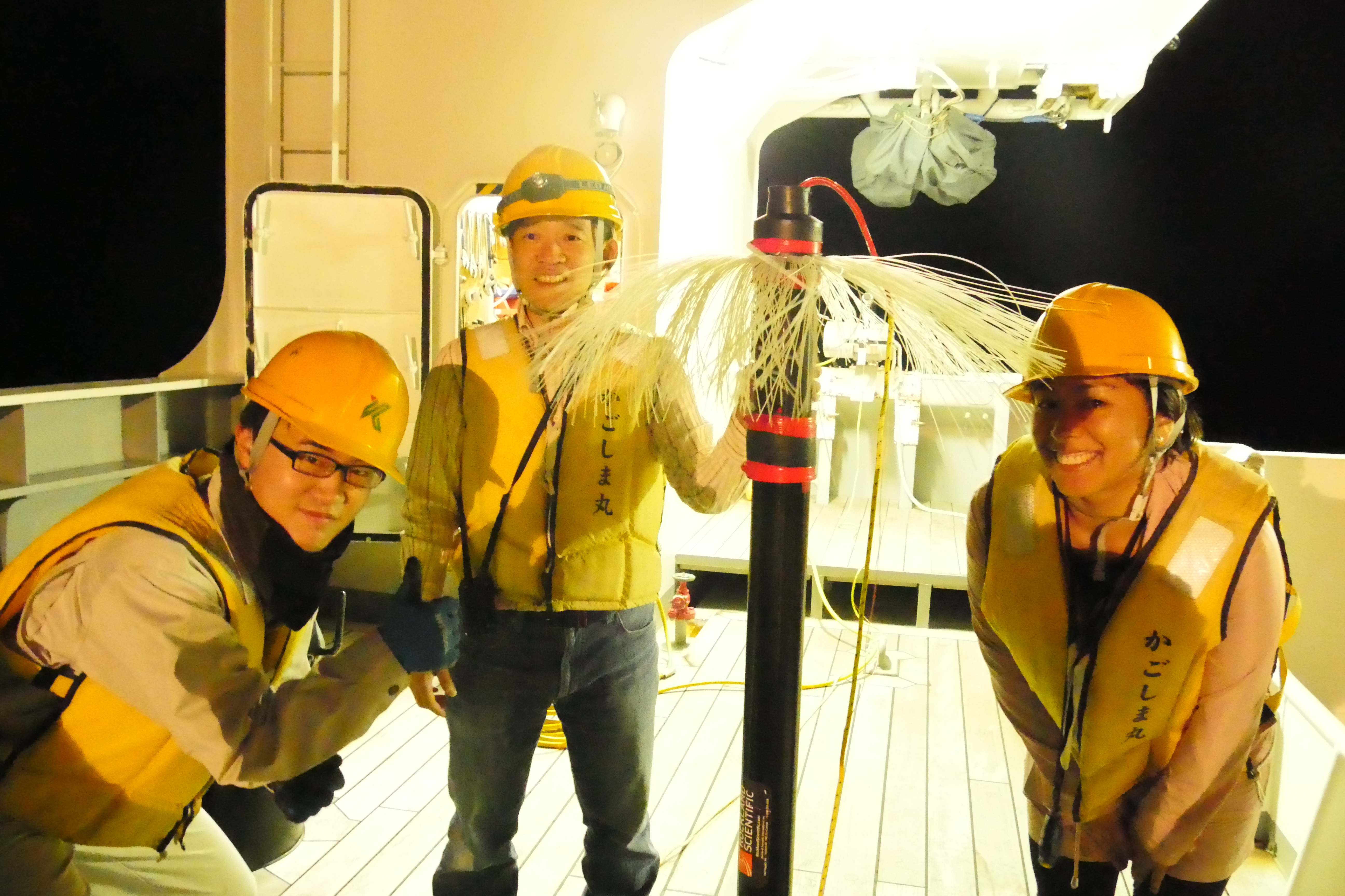 Turbulence is intermittent. That’s why scientists need to measure it at high spatial resolutions to know where mixing occurs. But measuring turbulence is not easy, because turbulence probes are very sensitive and easily detect unwanted signals caused by instrument motions by rope’s tension and electronic noises. “In fact, it can detect noises of your steps when it placed at the lab” added by Takeyoshi. His team developed the method to measure turbulence at 1-2 km horizontal resolutions using a tow-yo microstructure profiler without stopping a ship. They use 1.5 mm diameter Dyneema rope to let it sink quasi-freely without severe unwanted contamination from the rope’s tension and recover it to the surface repeatedly while a ship is steaming at a slow speed, 1-2 m/s. While yo-yo profiling is to keep deploying and recovering the instrument vertically at one location like a yo-yo, this method is called tow-yo profiling. Using this new technique and Training vessel Kagoshima-Maru (Kagoshima University), the authors and participants of cruises found the enhanced turbulence by 100-1000-fold compared to typical interior ones, that spreads over 100 km scale along the Kuroshio behind the seamounts.