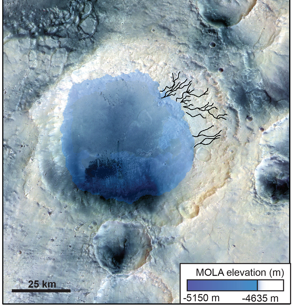 Figure 2: HRSC elevation data have been colorized and draped onto image data for McLaughlin crater lake, which was approximately 500 metres keep, around 3.8 billion years ago. There are small channels inside the basin possibly formed by groundwater springs or snow melt, which all terminate at approximately the same elevation - which was the level of the lake. Note however, that there are no large external channels feeding the lake, indicating that this type of basin was fed by groundwater.
