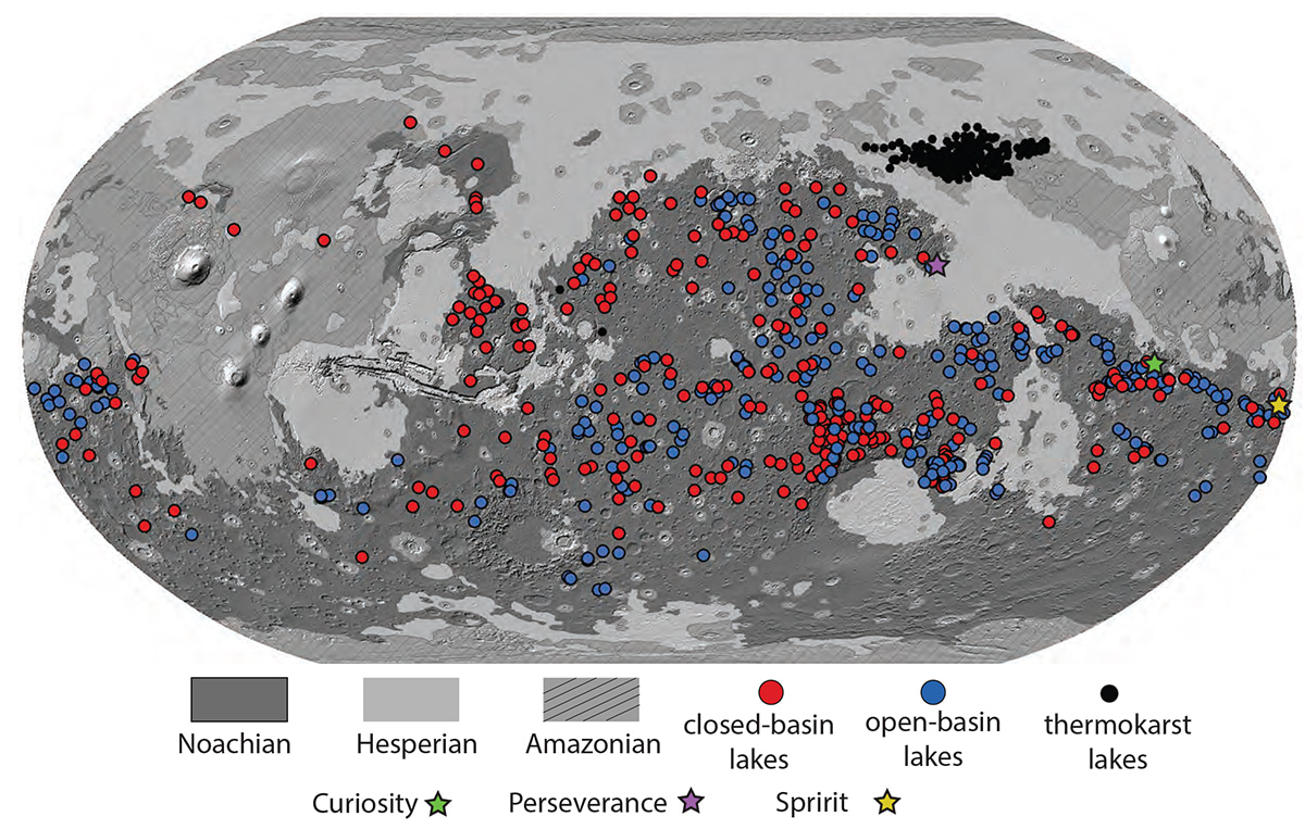Figure 3: Compiled global distribution of lake basins on Mars. Most lakes occur in Noachian terrain, although some occur in Hesperian terrain. Thermokarst lakes occur in Amazonian terrain. Landing sites targeting lake deposits described in the text are also labelled.