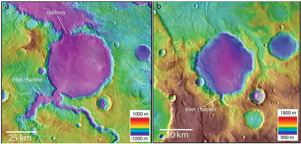 Figure 1: Mars Orbiter Laser Altimeter data draped over infrared (THEMIS) image mosaics show examples of an open-basin lake (a) and a closed-basin lake (b).