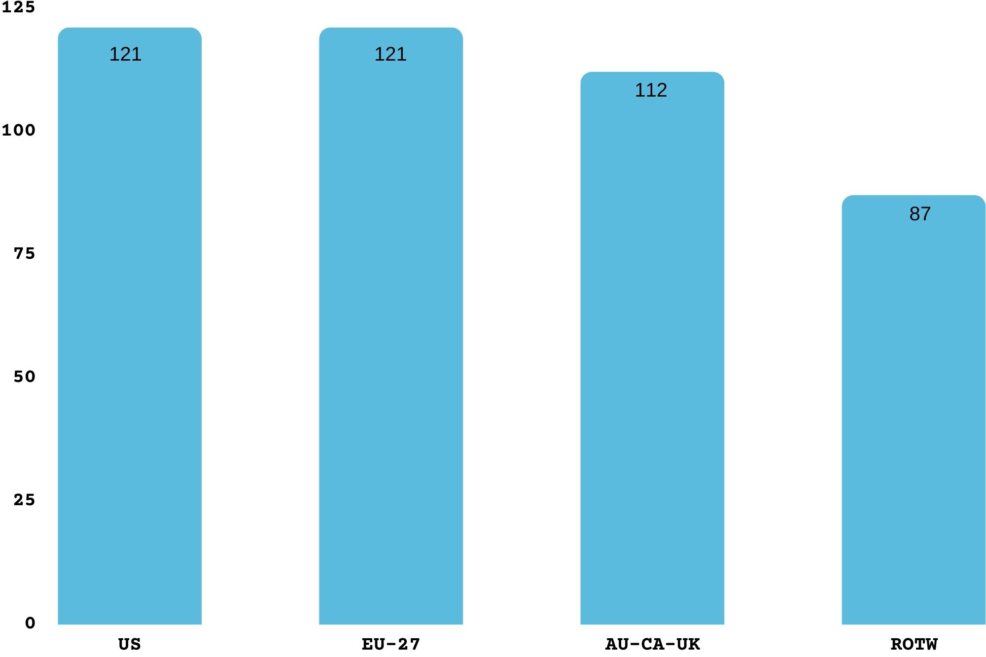 Fig. 3 demonstrates the additional insights that can be gained by comparing regions instead of countries. Here, it can be seen that in terms of sheer numbers of companies the US, the EU-27, and the AU-CA-UK are operating on similar levels. Meanwhile, the rest of the world (ROTW) does not possess that many start-ups. This can be related to the limitations of our dataset, the fact that start-up culture is more adopted by certain regions, some other factors, or a combination of these.