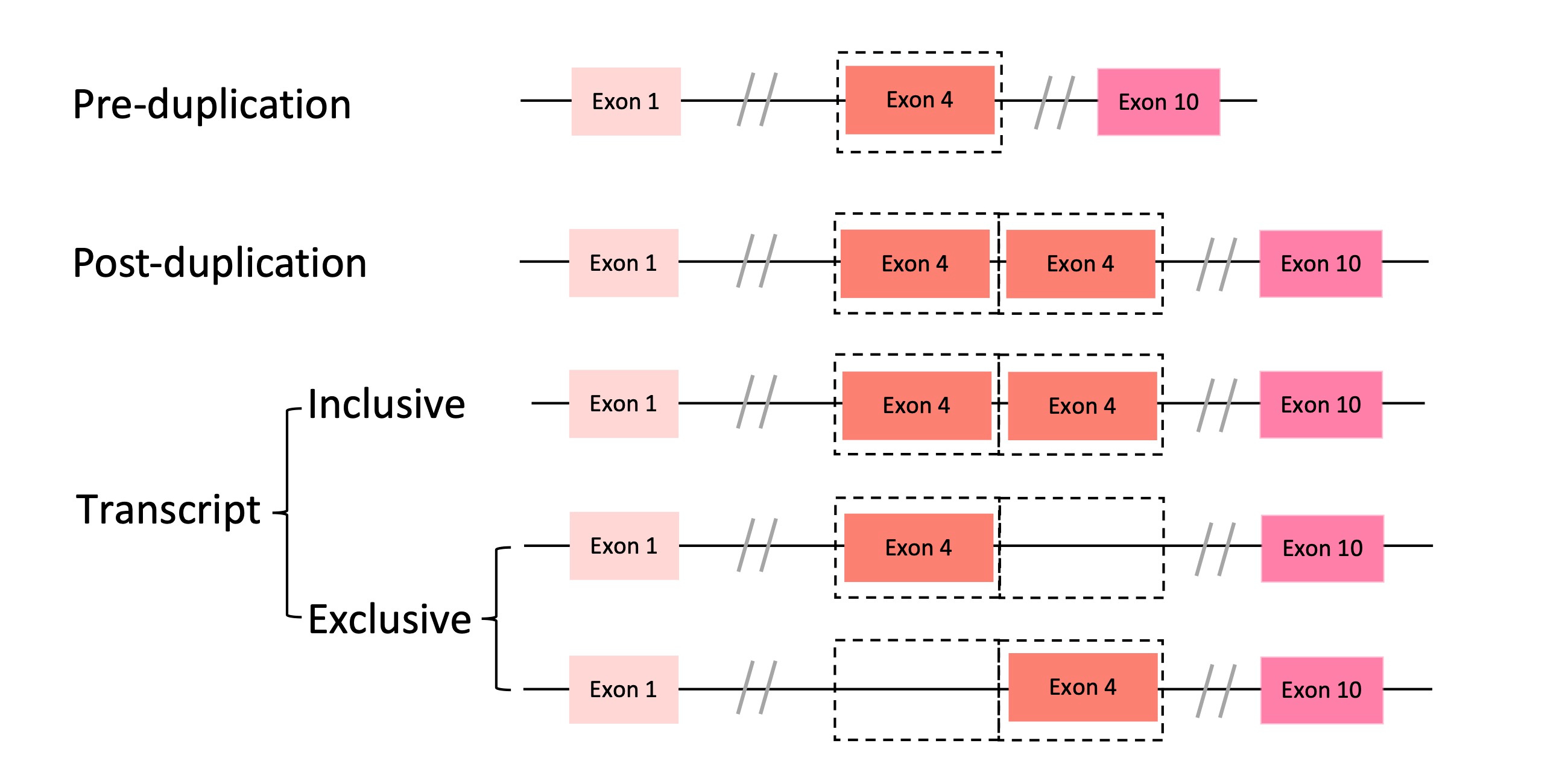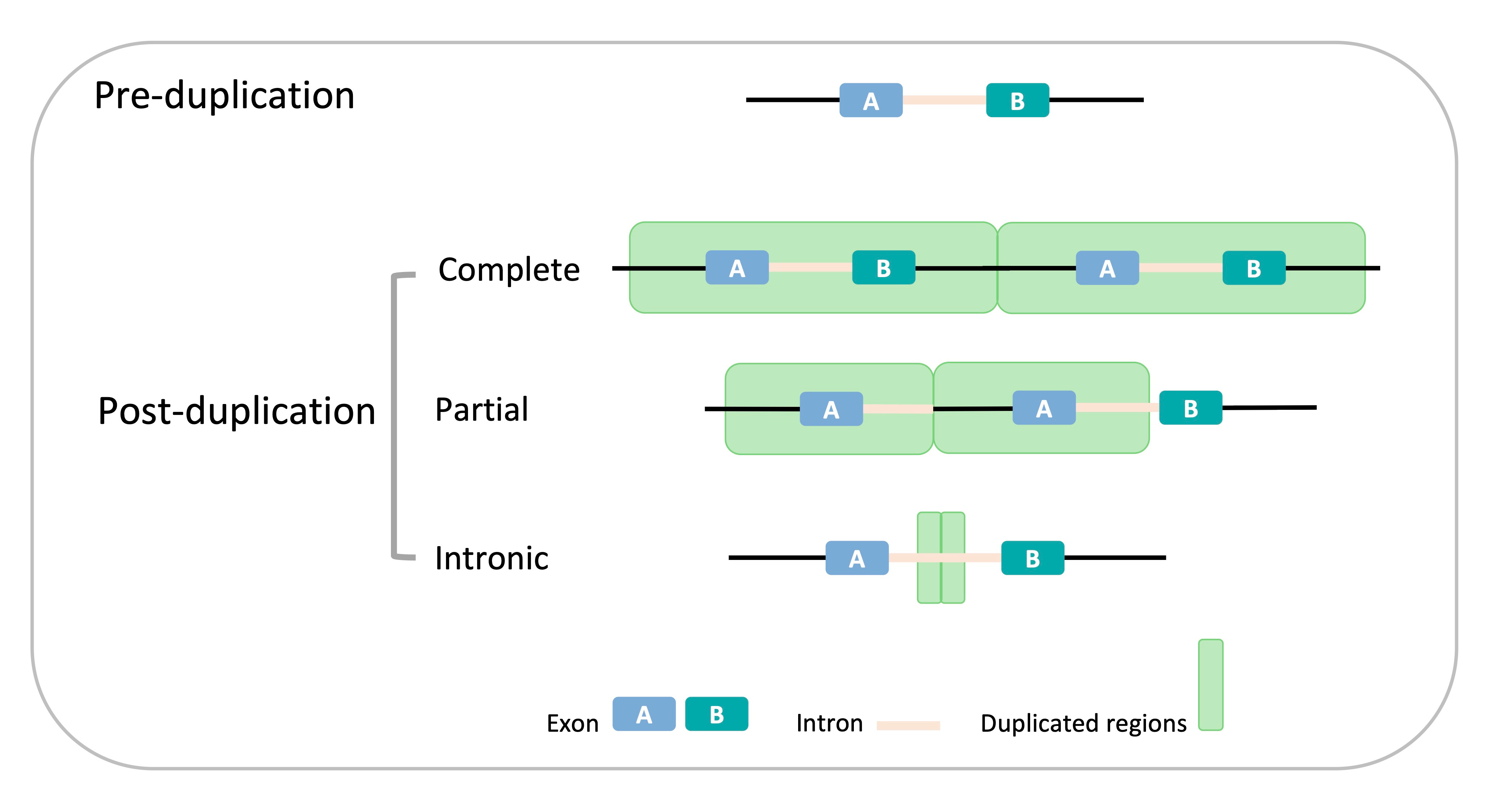 Our story started from a similar perspective. As illustrated in the title, we seek to investigate the landscape of youngest duplicates (polymorphic or only present in some individuals) in fly and human. Duplication is one of the most important mechanisms underlying evolutionary novelty; it ranges from small scale duplication to whole genome duplication, brings in new genetic material to the genome, and thus make the emergence of new function possible during evolution. The object of our paper is small scale tandem duplication, which is 50 bp to 25 kb long and located adjacent to its parental sequence. Such duplication is relatively small compared with the whole genome, and it may overlap with intergenic or genic region, just like a coin may overlap with the ocean or land part of a world map. So, our first task was to describe the landscape of duplication: in the very beginning phase of duplication, i.e., among these polymorphic duplicates, how many genes are duplicated? Moreover, how many genes are completely or partially duplicated, or just duplicated in the intron (Figure 2)?