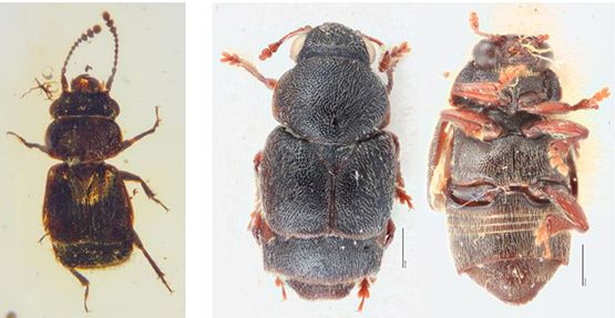 Left: Dorsal view of Pelretes vivificus, a Cretaceous short-winged flower beetle (Kateretidae) from Burmese amber (~99 Ma). Right: Jelinekiella aterrima endemic to Australia, possibly the closest living relative of Pelretes. Scale bars: 500 μm. Image credits: Chenyang Cai, Yanzhe Fu and Yitong Su (left), Lingzi Zhou (right).