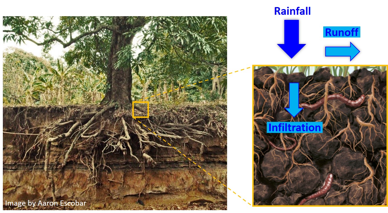 The growth and decay of plant roots and the activity of earthworms and other burrowing organisms that feed on plant residues create a network of interconnected burrows in the soil called macropores (Fig. 1). Such biologically-promoted soil structural features strongly favor infiltration of water into the soil (particularly during high intensity rainfall events) and may dominate local hydrological fluxes in natural landscapes such as forests, that cover nearly 30% of the Earth’s land surface. Specifically, soil hydraulic properties control the partitioning of rainfall between infiltration and runoff, thus affecting both groundwater recharge and surface water resources. Yet, despite decades of research on soil structure and its well-established role in regulating these water fluxes, attempts to include these effects in models remain limited. Particularly, the role of soil structure in large scale Land Surface and Earth System models commonly used for hydrological and climatological applications is largely ignored. These models use soil parameters derived from laboratory-scale measurements often based on samples from relatively uniform soils (mostly agricultural fields) thus avoiding “complications” of soil structure.