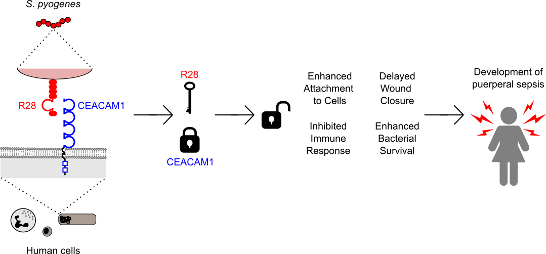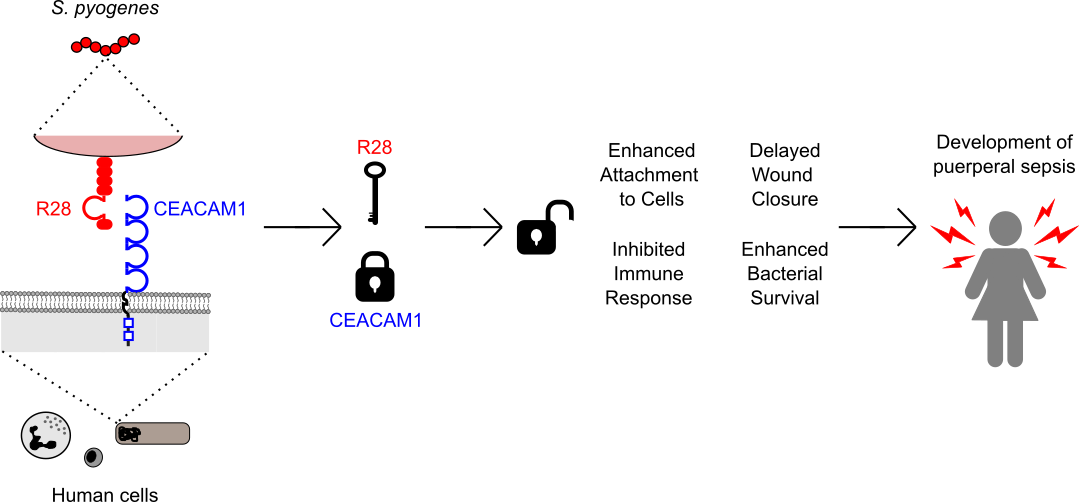 Puerperal sepsis has had an instrumental role in the development of germ theory, hand hygiene, antiseptic techniques, and molecular epidemiology. It is considered a classic example of a hospital-acquired infection. We feel our work presents a new chapter in puerperal sepsis research that may help to develop strategies to prevent this disease. Our findings demonstrate that the key bacterial molecule, R28, opens many doors to promote S. pyogenes pathogenesis by targeting a single lock molecule, CEACAM1, that is expressed in a variety of human cell types. This challenges the conventional belief in molecular microbiology that a single lock-and-key interaction is only relevant for overcoming a single host defence mechanism on the path to causing invasive disease.