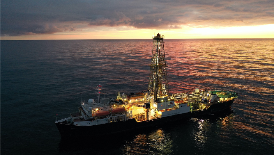 Drillship JOIDES Resolution during Expedition 396 in the North Atlantic. Photo: Peter Betlem.