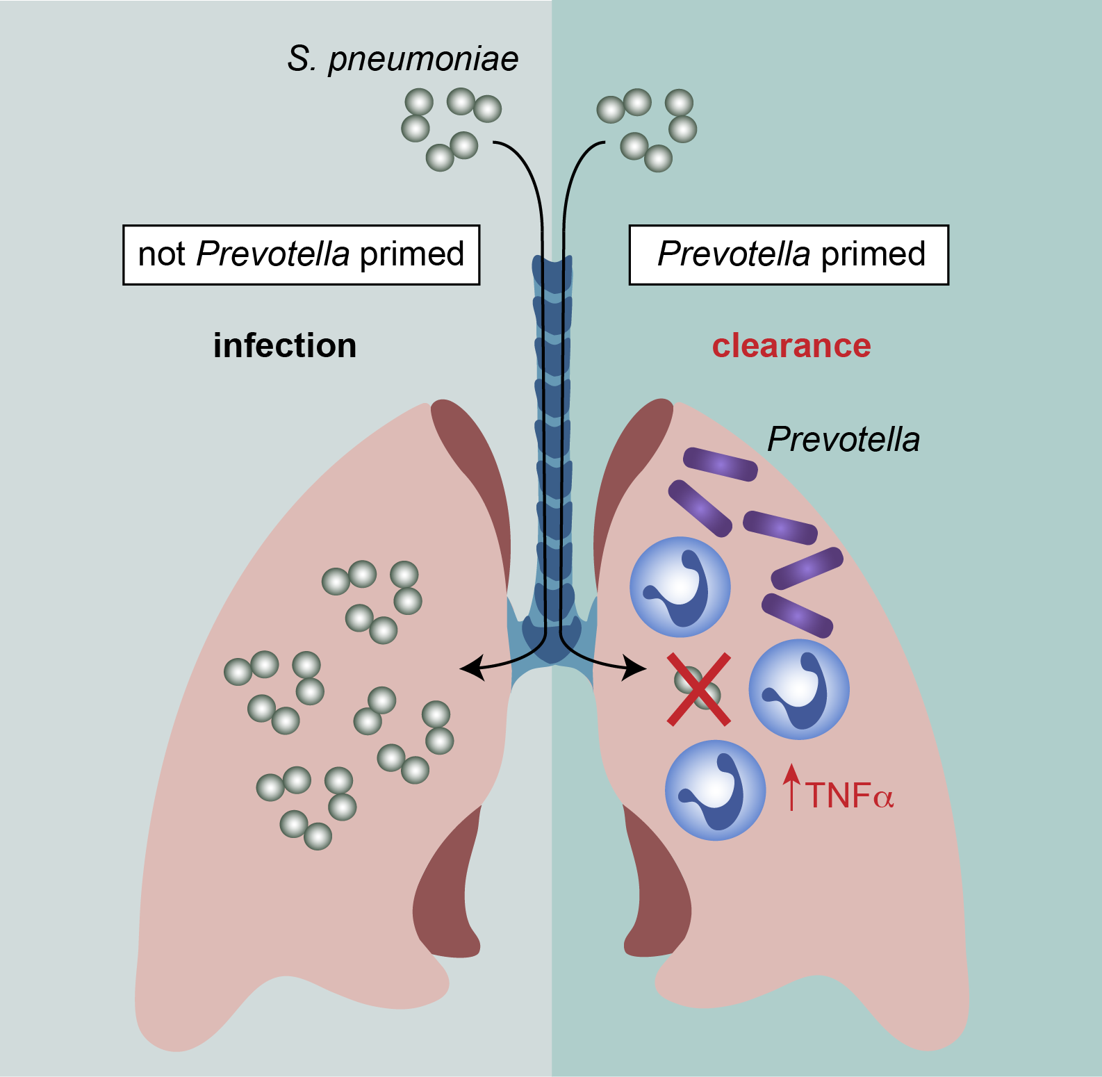 Although the lungs are constantly exposed to bacteria, we know little regarding how individual species interact with our immune system. We were initially intrigued by the ability of Prevotella, which are among the most abundant bacteria in the lungs1-3, to promote secretion of the anti-inflammatory cytokine IL-10 from host innate immune cells4,5. As our recent work indicated that IL-10 induced by the pathogen Streptococcus pneumoniae exacerbates infection6, we initially suspected that Prevotella would increase susceptibility to S. pneumoniae. Contrary to our expectations, when we tried this experiment in mice, we found the opposite to be true. Mice exposed to Prevotella rapidly cleared S. pneumoniae from the lung, resulting in either reduced or undetectable burdens of S. pneumoniae within 24 hours. Others reported a similar protective effect with the same species of Prevotella, Prevotella melaninogenica, in combination with other airway commensals7. Together, these findings informed a new hypothesis; that P. melaninogenica is a ‘beneficial’ member of the airway microbiome because it enhances protection against bacterial pneumonia.
