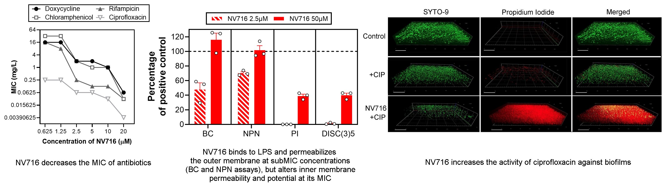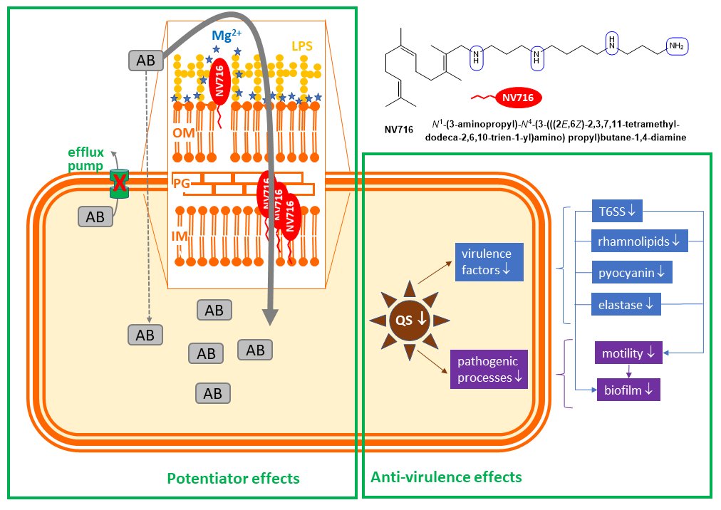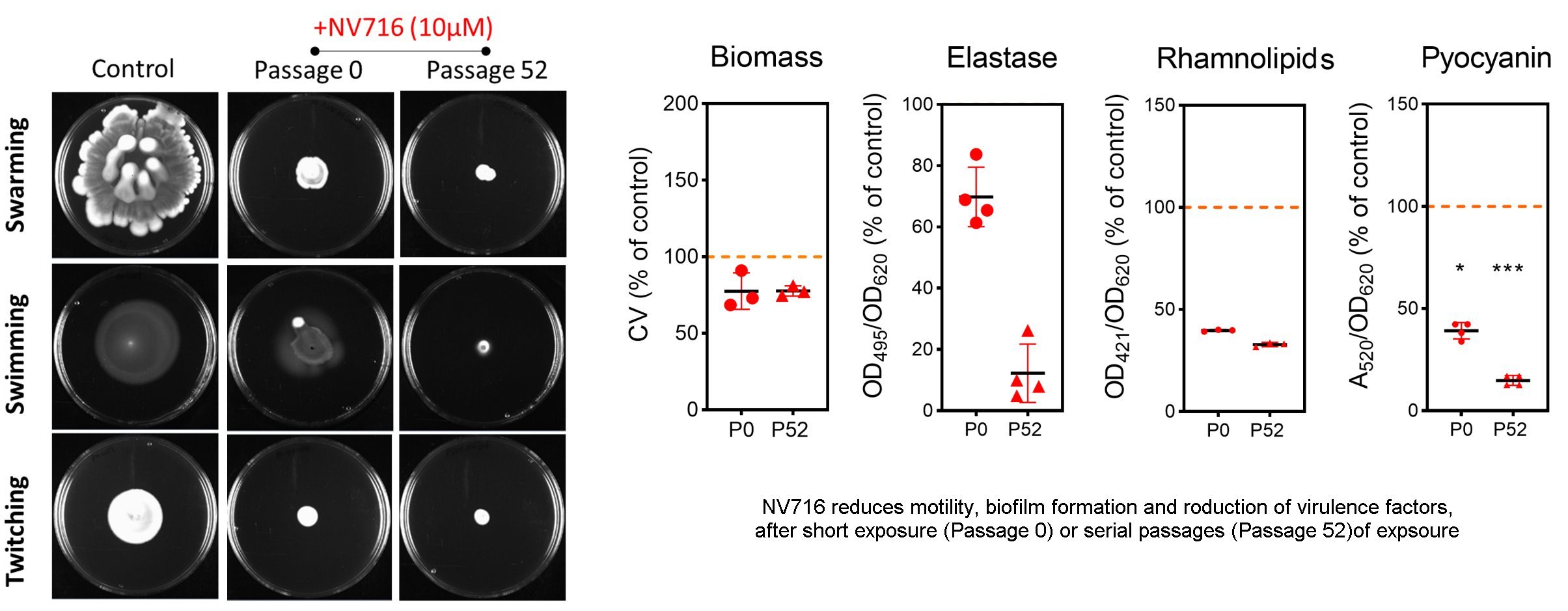 But NV716 also shows a series of unanticipated additional effects that reinforce its interest as an adjuvant to antibiotics. First, it prevents the selection of resistance to ciprofloxacin or rifampicin in serial passage experiments while being him-self incapable to select stable resistance using the same experimental approach. A transcriptomic analysis of bacteria exposed to NV716 highlighted an overexpression of genes involved in LPS synthesis and a downregulation of genes involved in virulence. At the phenotypic level, this translates in an inhibition of bacterial motility, of biofilm formation, or of the production of rhamnolipids, elastase or pyocyanin. All together, these properties confer also to NV716 and antivirulence activity.