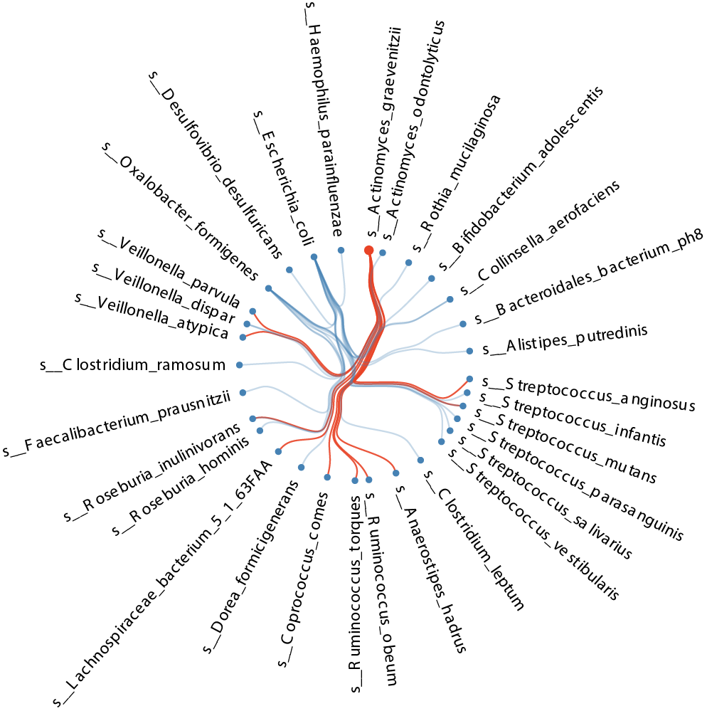 It is currently not possible to construct a humangut microbiota to study microbial interactions in health and disease as many microbes are not yet culturable. However, the gut microbial composition profile generated by shotgun metagenomics sequencing of large human cohorts does allow us to make inferences about microbial interactions in silico by assessing their co-abundance relationship (i.e., correlation of microbial abundance between microbes) and further comparing their differences between health and disease.