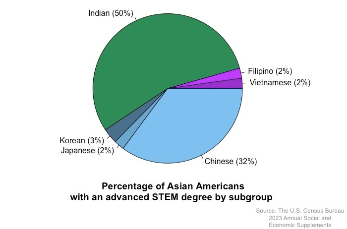 The percentage of Asian Americans with an advanced STEM degree by subgroup in 2023. Data obtained from the U.S. Census Bureau.