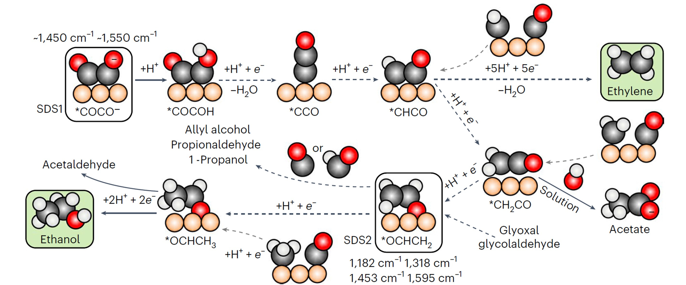 The electroreduction of CO2 enables the conversion of carbon dioxide, water, and electric energy to a wide range of chemicals. So far, the scale up of this technology is limited to the production of carbon monoxide and formic acid, while generation of multi-carbon products is hindered by unstable activity and low selectivity.1 Beyond C1 molecules, many reaction products occur during CO2 electroreduction on copper, primarily ethylene, ethanol, and n-propanol, albeit up to 10 C2+ species have been reported in literature.2 Since pioneering reports by Hori,3 adsorbed carbon monoxide (*CO) has been indicated as a crucial intermediate along the C2+ products route. Besides, being ethanol and ethylene formation rates independent from electrolyte pH, the dimerization of CO via a single electron transfer is currently assumed as the rate-determining step for both these C2 products.4 After the formation of the dimer, several proton-coupled electron transfers take place till the formation of OCHCH2, the last common precursor between ethylene and ethanol. From this species, the final products originate. Due to the entanglement of the reaction pathways, the hydrocarbon and the alcohol usually appear together,2 limiting the selectivity of the process. Thus, the CO2 reduction puzzle seems resolved. However, while the CO dimer has been observed via spectroscopic techniques,5 there is no experimental evidence of the *OCHCH2 intermediate. Besides, remarkably, the ethanol-ethylene pair breaks during reduction of other precursors, such as glyoxal and glycolaldehyde for example.6