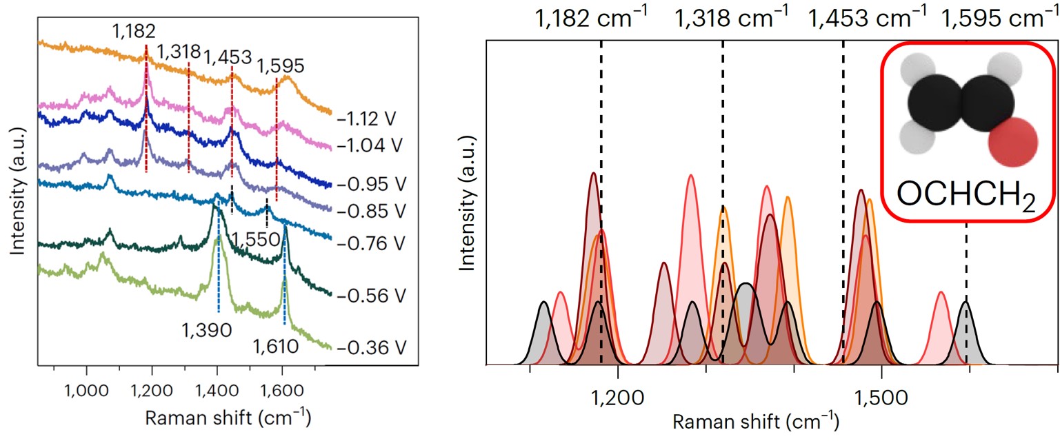 Here is where our story starts. Right after the completion of a previous study about CO coverage effects on ethylene selectivity,7 by analyzing new surface-enhanced Raman data during CO2 electroreduction, we bumped into four new vibrational signals, i.e., 1182, 1318, 1453, and 1595 cm–1. Surprisingly, these features occurred together at an applied potential between –0.85 V and –1.12 V vs RHE and were not fully compatible with the CO dimer. Were they spurious signals due to carbonate in solutions? We assessed perchlorate electrolytes, and we still observed analogous features. Did these vibrations involve carbon atoms? Our 13C/12C isotope exchange experiments confirmed, and analogous signals appeared during CO electroreduction. At that point, we could infer from literature that an intermediate with O and C atoms was responsible for the signals, yet we could not resolve its nature. We turned to density functional theory vibrational analysis. We computed the vibrational frequencies of seventeen potential adsorbates during CO2 electroreduction on nine copper active sites with different coordination numbers (data available in Supplementary Information). Just one molecule showed compatible signals, OCHCH2.