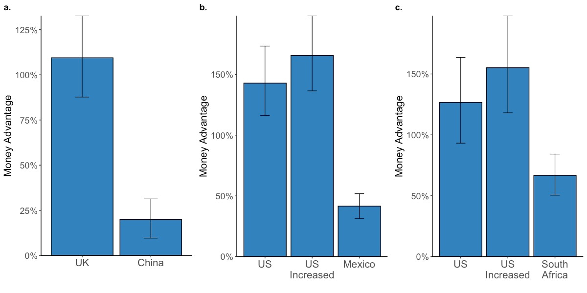 The Money Advantage was Larger in the US and UK and Smaller in Non-WEIRD Cultures.