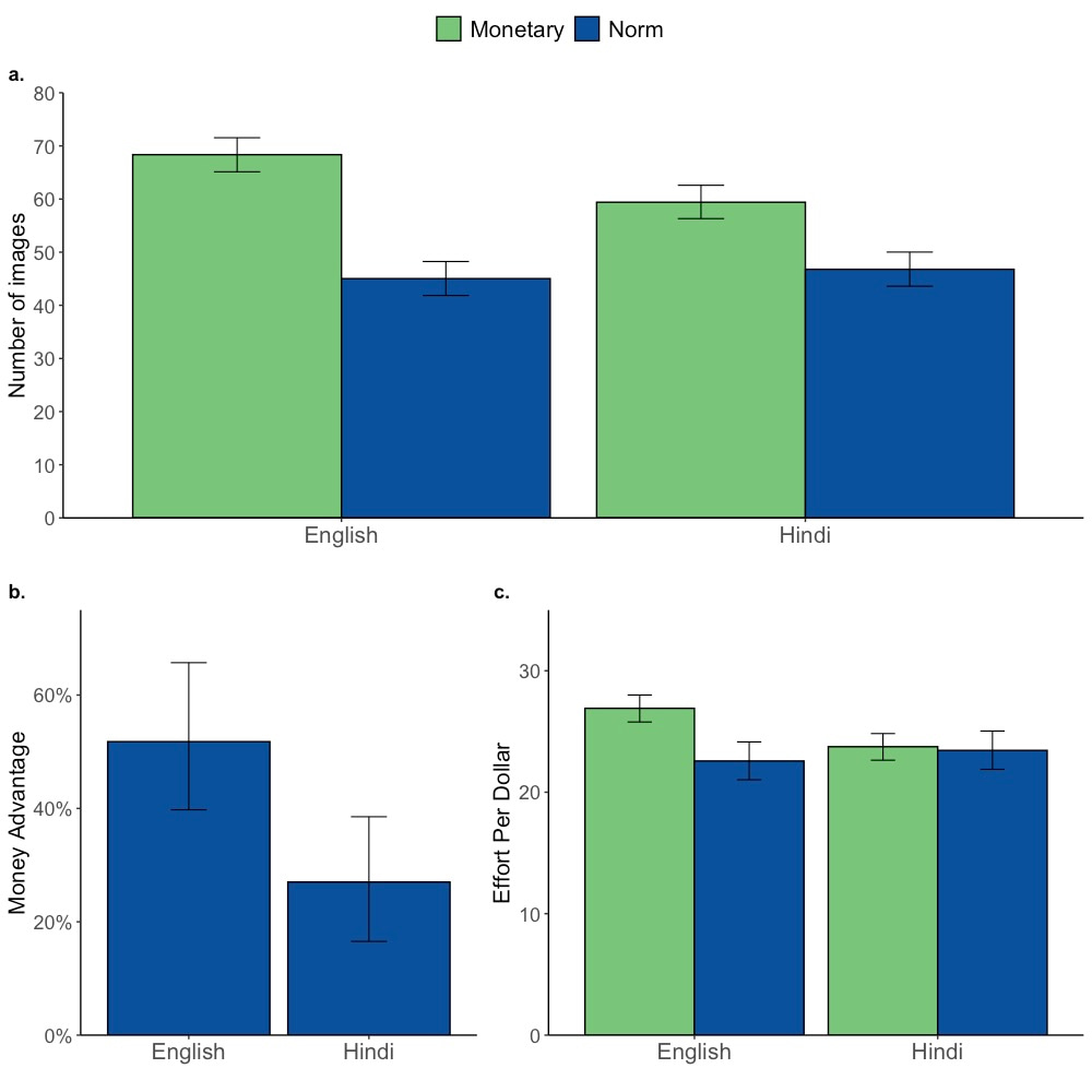 Even when the only difference was the language, the difference emerged again. Money was more motivating in English than in Hindi. People who worked in English were also more likely to agree with the statement that they completed the task “only for money.”