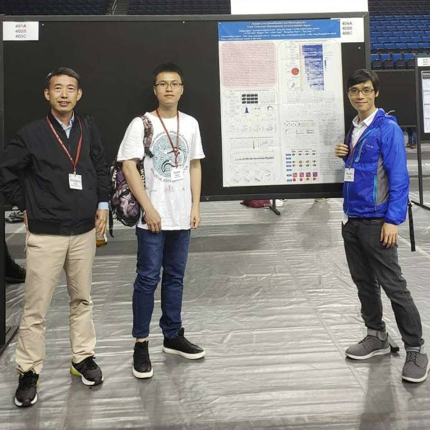 Fig. 3. Prof. Zhongying Zhao (Left), Dr. Guoye Guan (Middle), and Dr. MingKin Wong (Right) presenting their project in the 19th International C. elegans Conference, photographed in the summer of 2019.