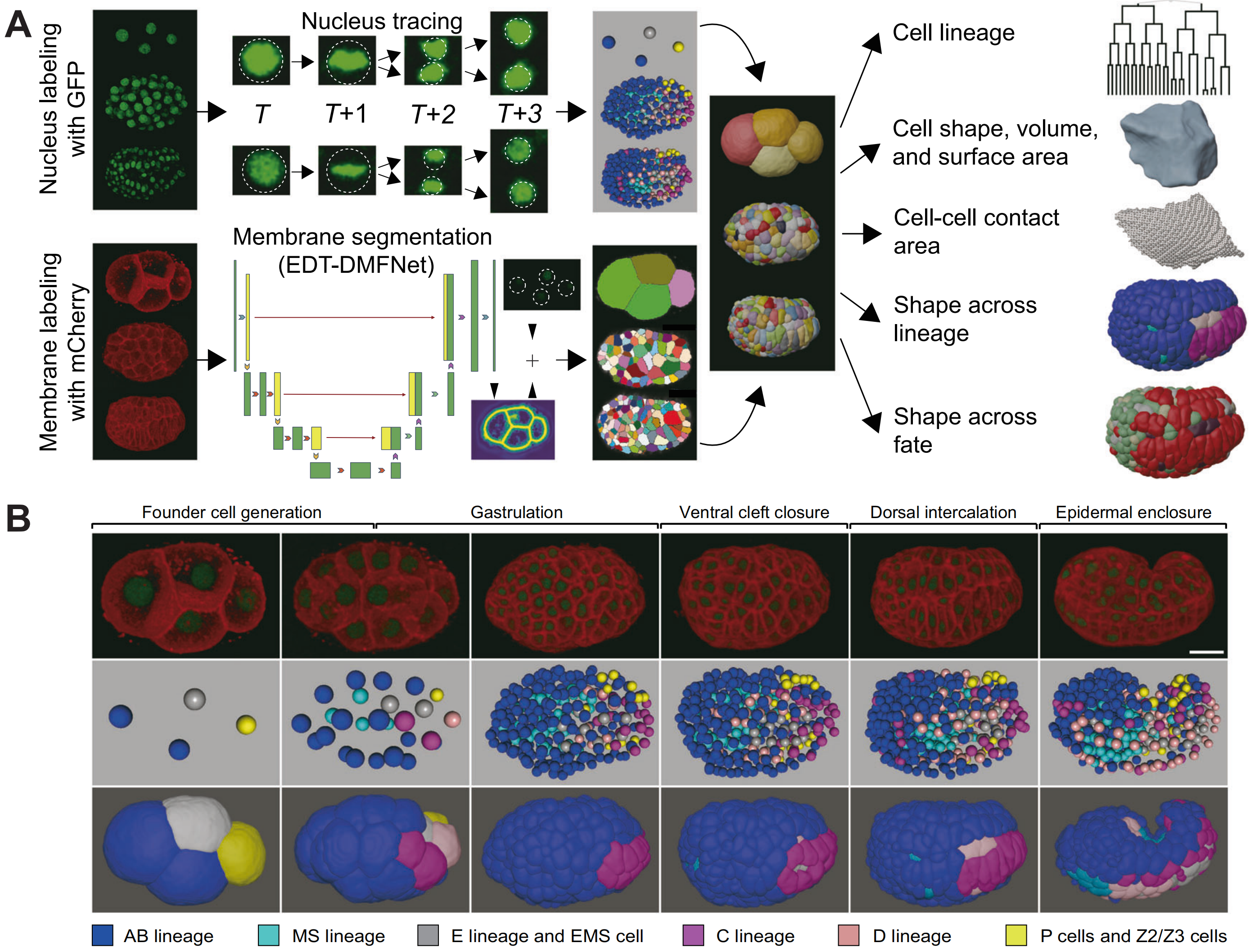 Fig. 1. (A) An in vivo and in silico framework for quantifying a worm embryo’s cell-resolved morphologies. (B) A worm embryo’s cell-resolved morphologies in different lineages and at different stages.
