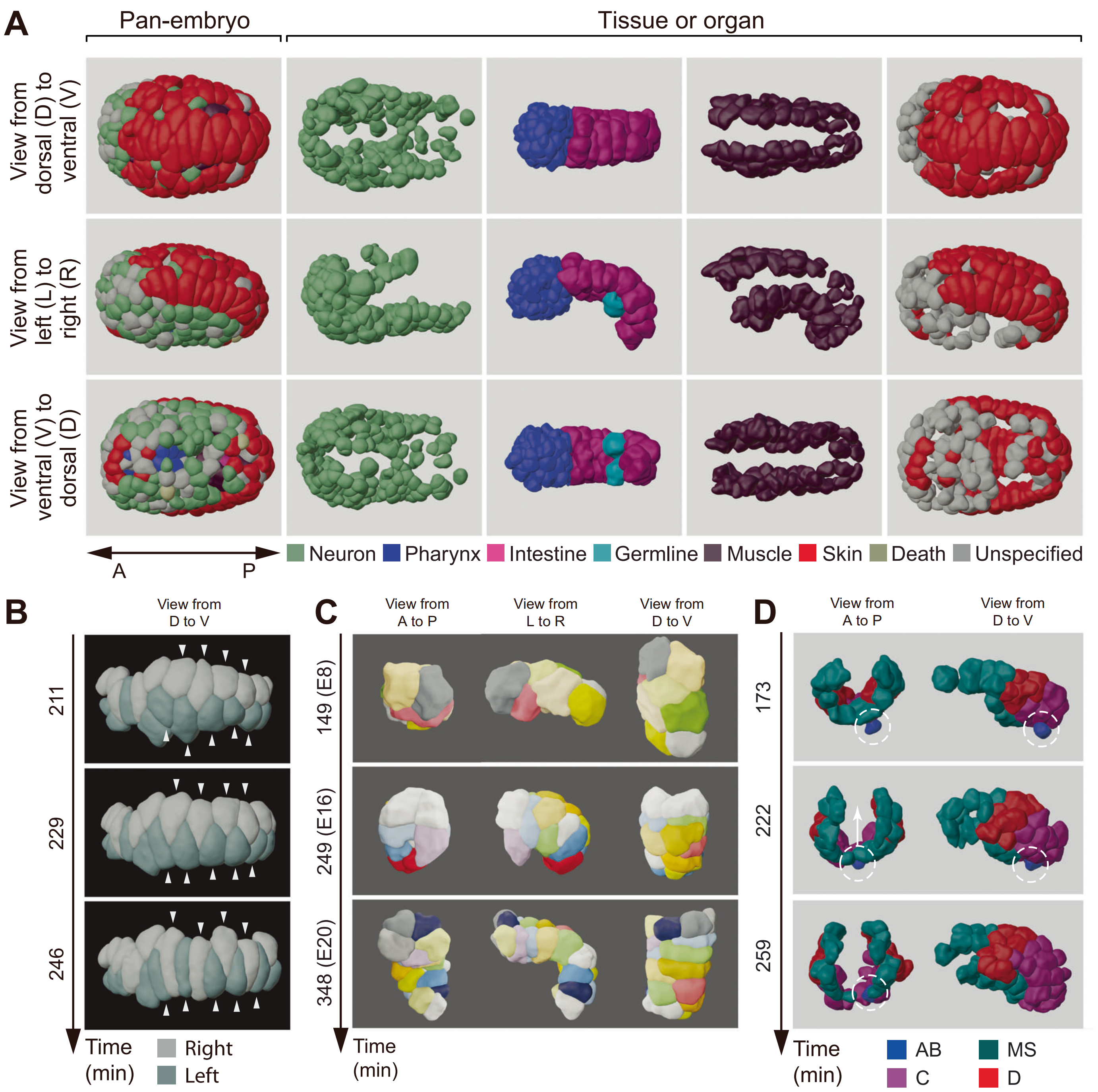 Fig. 2. (A) A worm embryo’s cell-resolved morphologies in different tissues and organs. (B) Morphological change of dorsal skin over time. (C) Morphological change of intestine over time. (D) Morphological change of body-wall muscle over time.