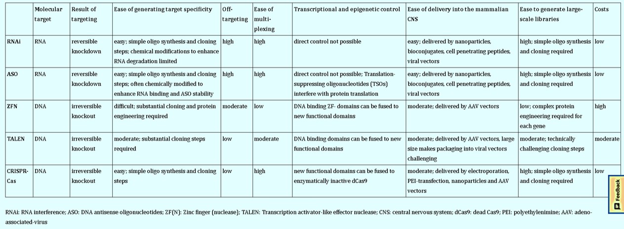 Several gene editing tools exist for refined gene regulation, beyond a simple gene knockdown status (Table 1) to understand molecular underpinnings of the nervous system, in general (Figure 9) [Heidenreich M. and Zhang F. 2015, Geurts A. et al. 2010]. Technically, a nuclease-inactivated version of Cas9 (dCas9 or deadCas9) can fuse with diverse functional enzymatic domains to mediate transcriptional regulation in the form CRISPR-interference [Gilbert L. et al. 2013].