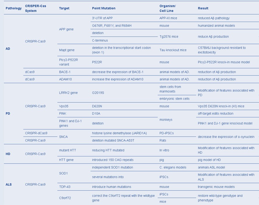 Recent investigations of CRISPR advances in neuroscience have used Cas proteins to edit the epigenome, to potentially treat a variety of neurological disorders such as Alzheimer’s disease, Parkinson’s, and autism, by better understanding their mechanisms-of-action [Heidenreich M. and Zhang F. 2015]. Four of the most diffuse neurodegenerative disorders include Alzheimer’s disease, Parkinson’s disease, Huntington’s disease, and amyotrophic lateral sclerosis (ALS) [Plano L. et al. 2022]. Several implementations of the CRISPR-Cas system have facilitated humanized animal models to understand these disease mechanisms, in order to optimize treatment strategies from the bench-to-clinic (Table 2) [Serneels L. et al. 2020, Wulansari N. et al. 2021, Plano L. et al. 2022].