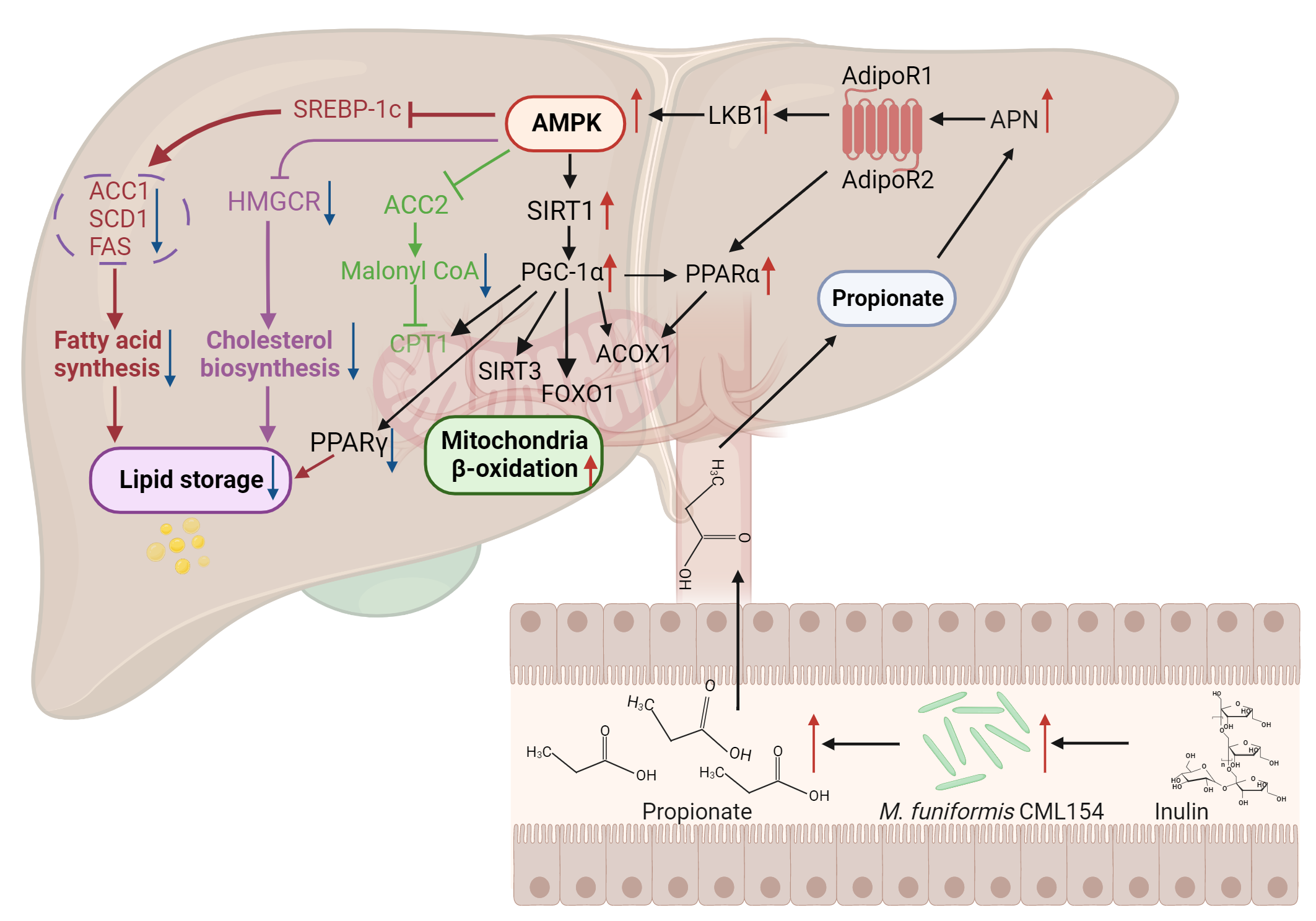 We next gavaged M. funiformis CML154 to the MAFLD laying hen model, and verified the role of this strain in attenuating MAFLD. Interestingly, although strain CML154 is isolated from laying hens, it also works in attenuating MAFLD in mice model, displaying a cross-species effect in the regulation of host lipid metabolism. How does M. funiformis CML154 regulate lipid metabolism? We found that strain CML154 is a short chain fatty acids (SCFAs) producer, with the major product of propionic acid. All our in vivo results confirmed that both inulin and strain CML154 intervention increased the propionate concentration in the host gut. Mechanisms involved in the propionate-mediated lipid-lowering effect was further explored using hepatocyte model of hepatic steatosis in a Transwell co-culture system. Combing all the in vivo and in vitro results, we demonstrated that the anti-MAFLD effect of M. funiformis CML154 is due to the activation of the APN-AMPK-PPARα signaling pathway by its production of propionic acid (Figure 1).