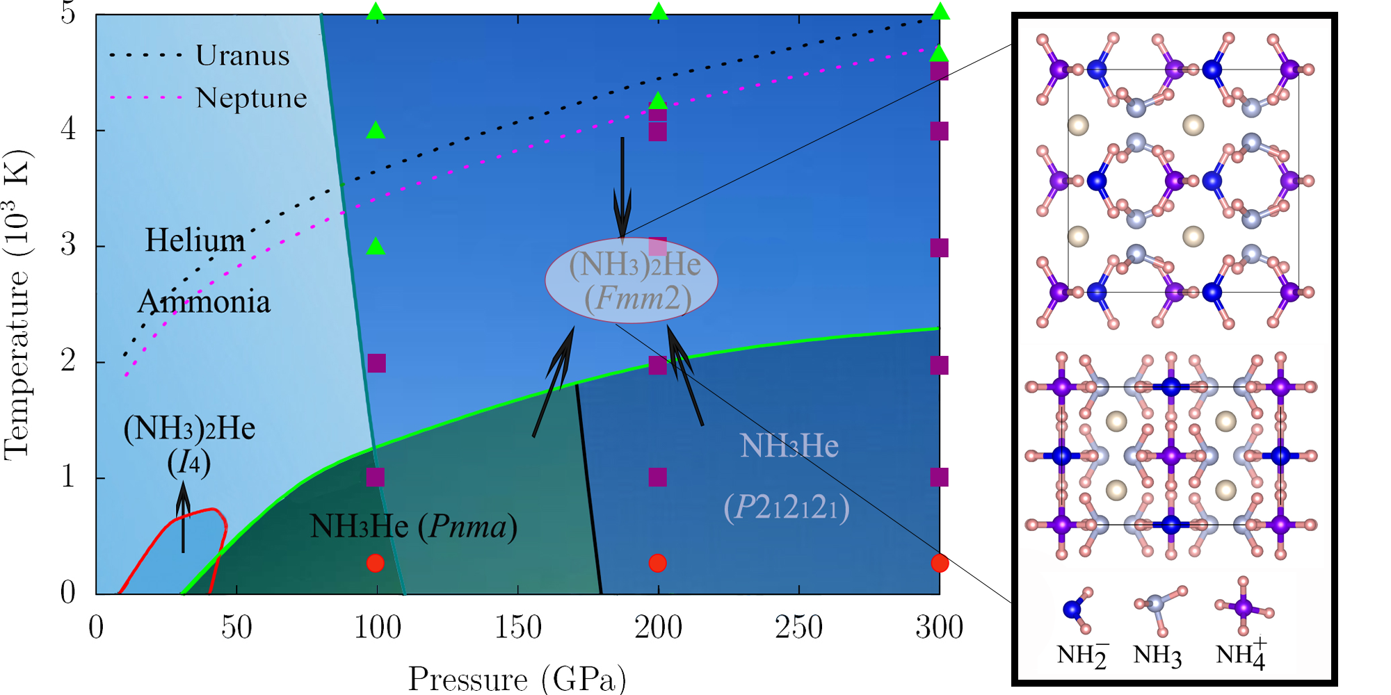 Helium is generally considered to exist only in the atmosphere of planets such as Uranus or Neptune. A long-held consensus is that helium cannot form solid compounds because of its stable closed-shell electronic configuration. Recent studies have indicated that high pressure can induce He to form compounds such as HeN41, Na2He2, FeHe3, MgOHe4, H2OHe5,6 and FeO2He7. These results inspired us to explore whether helium could be trapped inside the mantles of Uranus and Neptune in the formation of helium-containing compounds. NH3 is one of the most component for the upper mantle of the Uranus or Neptune, therefore, we carried out calculations to search for stable compounds in NH3–He systems at high pressure and high temperature.