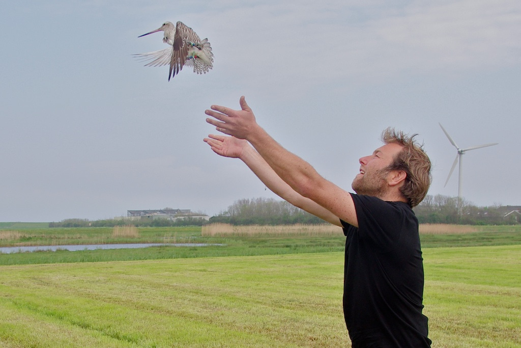 Photo 3. Co-author Job ten Horn releasing a freshly captured bar-tailed godwits, now with known biometric details and individualized with a set of colour-rings, on the Wadden Sea island of Texel in May 2016. Photo by Rob Buiter.