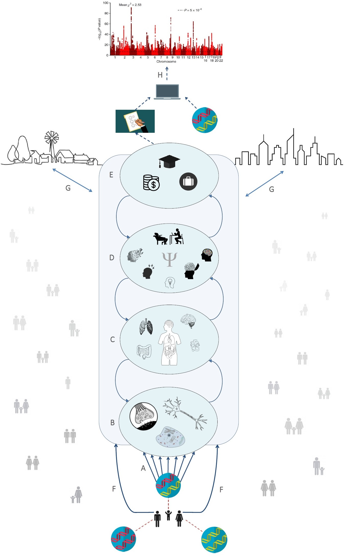 Figure: Polygenic effects (A) travel through many cascades of biological processes that react to environmental stimuli to end up associated with behaviour. Proteins built as a result of instructions in the DNA perform vital functions on the cellular level (B). Complex networks of cells make up organs, complex network of organs make up the human body (C), and complex network of humans make up society (G). Individual differences in biological make-up (B, C) in combination with environmental differences in exposures from family (F) and society (G) explain individual differences in behaviour (D). Behaviour plays an important role in determining one’s place in society, which is often measured through socio-economic outcomes such as education, occupation, and income (E). Modern behavioural genetics research has so far focused largely on associations between genetic variants and complex behavioral outcomes (H, which shows GWAS results for educational attainment based on DNA from 1.1 million people). In our Nature Human Behaviour article we outline how to disentangle the processes in between.