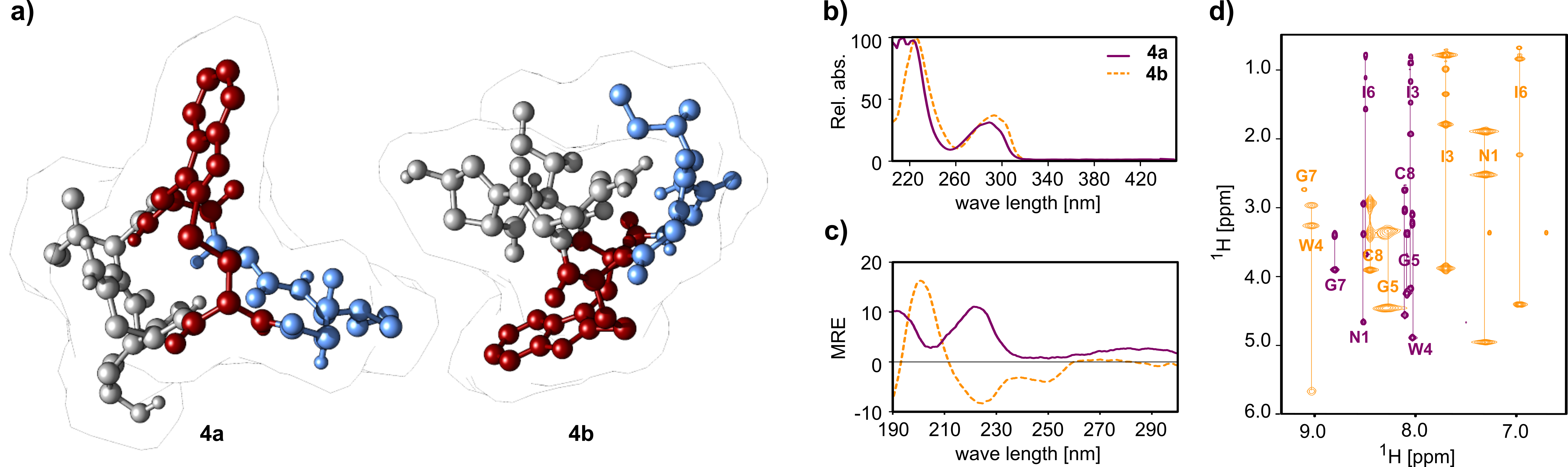 We used Ile3-S-deoxo-amaninamide (amanullin) as a simplified model system to screen for optimal macrolactamization sites employing HATU or EDC/HOAt as coupling reagents. In several of our syntheses, we obtained two products (4a and 4b) with identical molecular mass. This triggered an in-depth analytical investigation by Marfey amino acid analytics, X-ray crystallography, NMR and CD spectroscopy which clearly confirmed the presence of two different configurational isomers and we were able to exclude epimerization of amino acids (Figure 2). Moreover, we were able to show that not only is the location of the tryptathionine bridge inverted but the overall conformation of 4a and 4b is drastically different from each other. MD simulations of 4a and 4b and a monocyclic precursor 3b showed that the pre-organization of the intermediate plays a key role for the isomer formation.