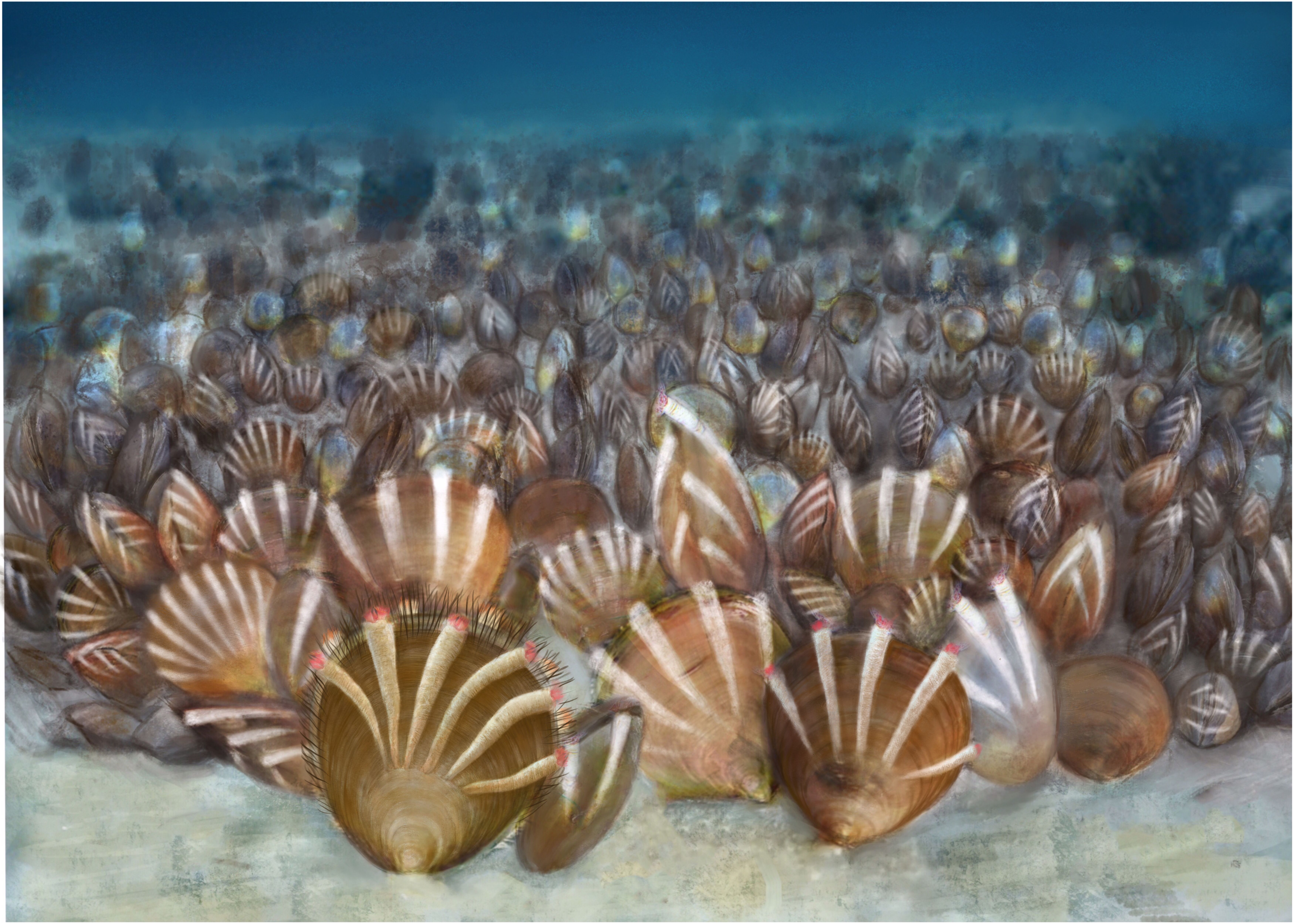 Reconstruction of this unique community, showing thousands of brachiopods encrusted with their kleptoparasitic tubes forming meadows on the Cambrian seafloor.