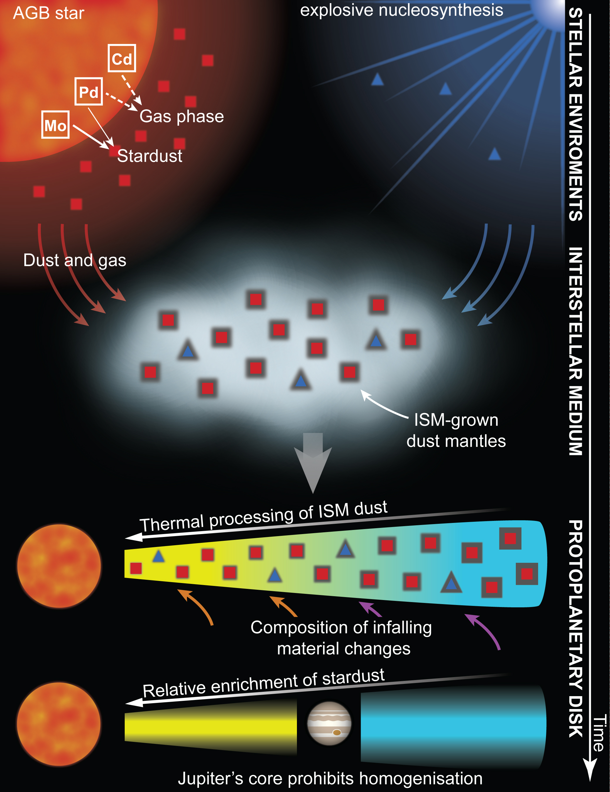In short, our model postulates that as dust was accreting to the protoplanetary disk it was subjected to thermal processing, due to irradiation by the young Sun, that preferentially destroyed interstellar dust that lacks the unique stellar isotopic fingerprints that we find in stardust. This resulted in a relative enrichment of stardust, that was predominately made up of s-process material, in regions closer to the sun. This explains why we find correlated nucleosynthetic anomalies in meteorites that have an s-process isotopic signature. The smaller nucleosynthetic anomalies we find in palladium, compared more refractory elements, and the lack of resolvable anomalies in more volatile elements can be explained by incomplete condensation of elements into stardust in s-process stellar environments. The more volatile elements will instead be homogenised and incorporated into dust in the interstellar medium, thereby losing its unique stellar signature.