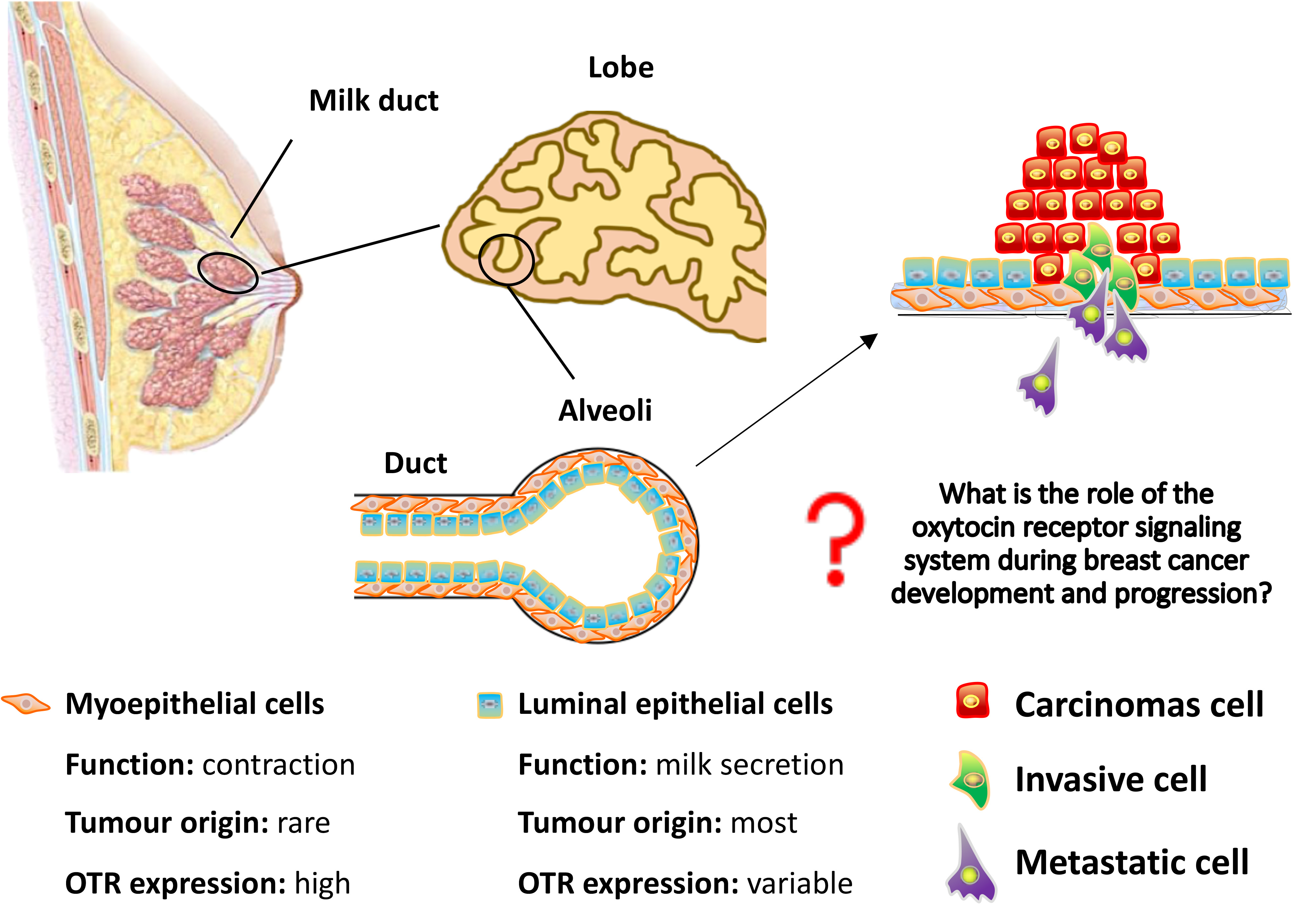 In our recent review published in Oncogene, we provide a comprehensive and up-to-date overview of OT/OTR signalling in breast cancer. We looked at OTR signalling in the normal breast as well as in breast cancer and tried to identify which pathways are particularly relevant for breast cancer development or prevention. Many of the signalling studies of the OT/OTR system have however been carried out in different cell systems other than normal breast or breast cancer cells, and we are still far away from having OTR drug candidates suitable for clinical studies, despite the efforts taken in this field. Broader and more systematic studies are required to define the therapeutic potential of OTR in breast cancer management. Nevertheless, we hope that this review provides a clear overview of the status quo of the field and that it will inspire others to join us in investigating the OT/OTR system in breast cancer, which we consider a promising target for breast cancer diagnosis and treatment that is worth pursuing.