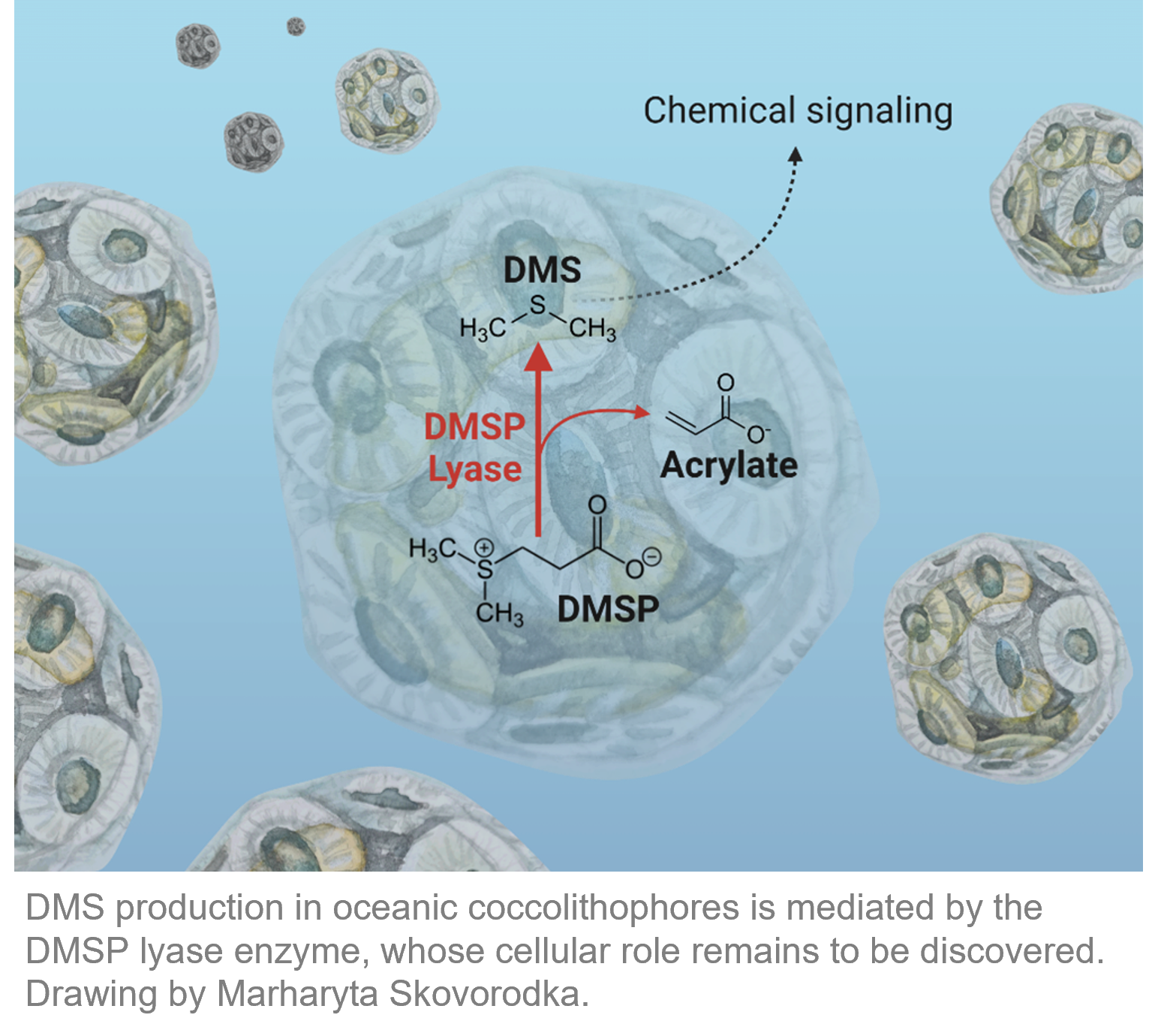 There are several hypotheses that can be tested to explain the paradoxical role of DMS in phytoplankton. For example, the protein producing DMS in the eukaryotic cells, a DMSP lyase enzyme3, may serve a vital role to promote cellular homeostasis during growth. Algae that live in the sunlit ocean are exposed to high oxidative stress from photosynthesis byproducts and UV radiation. The DMSP lyase enzyme was suggested to act as part of the cell’s antioxidant system, controlling the level of DMS and its precursor, dimethylsulfoniopropionate (DMSP), which are potent scavenges of reactive oxygen species. Yet proving the antioxidant hypothesis and other suggested cellular roles is a challenging task. Only a few algal DMSP lyase enzymes were isolated so far, which causes a major bottleneck to study this enzyme function. Among the algal species that are available in culture, we lack models that can be genetically transformed in order to learn about their gene function. Therefore, we must develop new model systems and experimental setups to understand why phytoplankton generate DMS in the ocean.